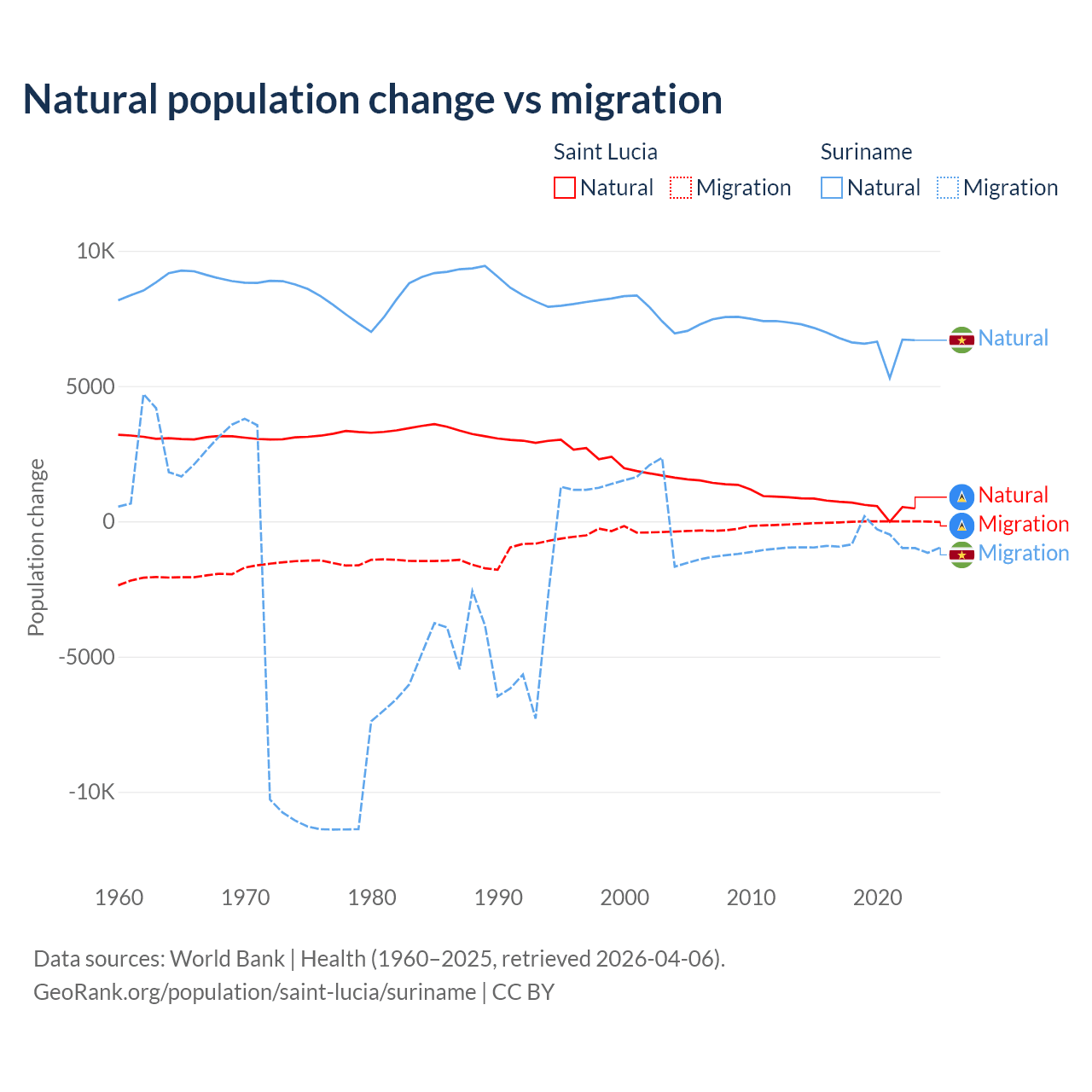 Over the last 10 years, 95.7% of the population change in Saint Lucia is from natural causes (a gain of 6,039 people) and 4.31% is from migration (a loss of 272 people). In Suriname 90.3% is from natural causes (a gain of 66,709 people) and 9.72% is from migration (a loss of 7,185 people).