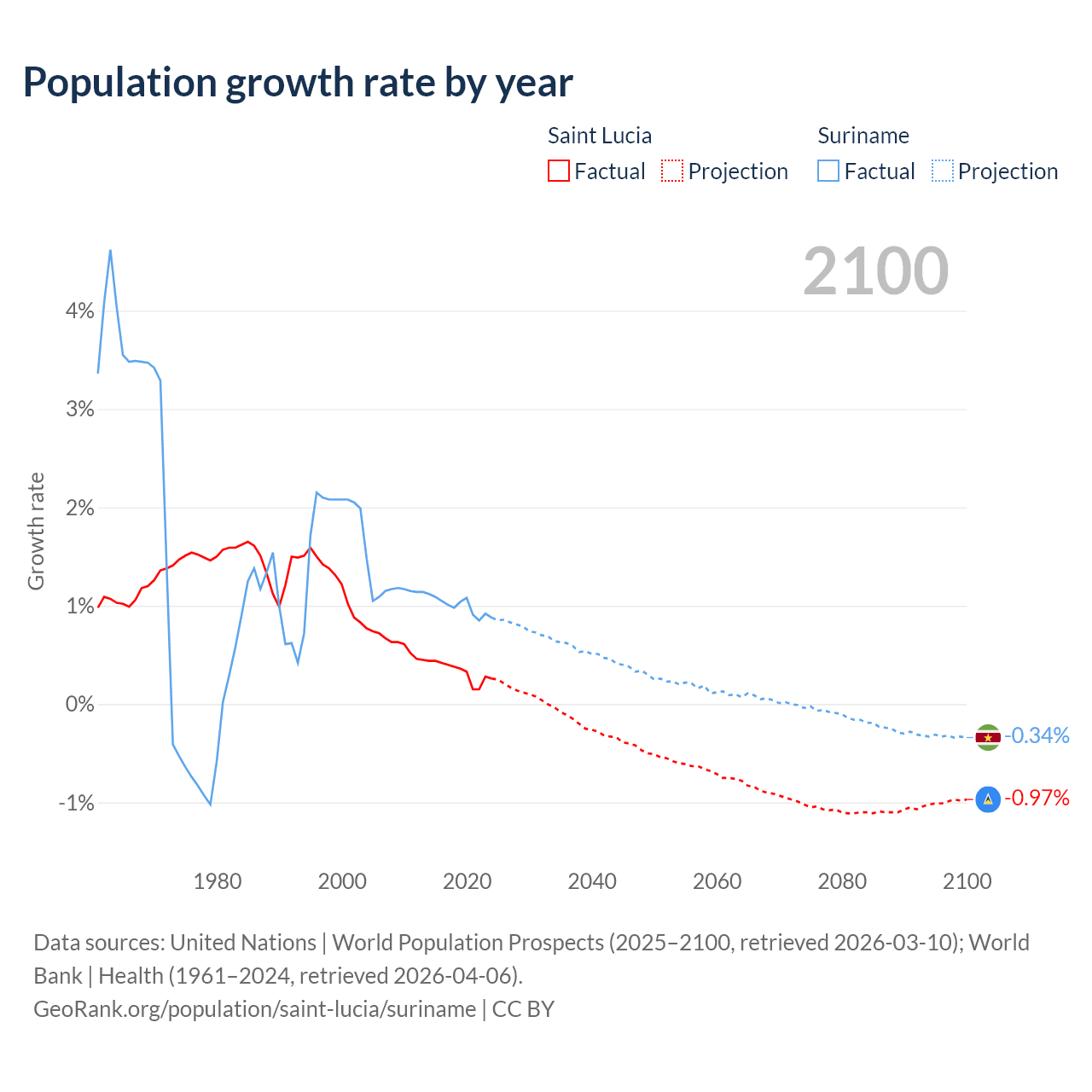 - For the last 10 years, Saint Lucia has had an average growth rate of +0.33% per year vs +0.99% in Suriname.