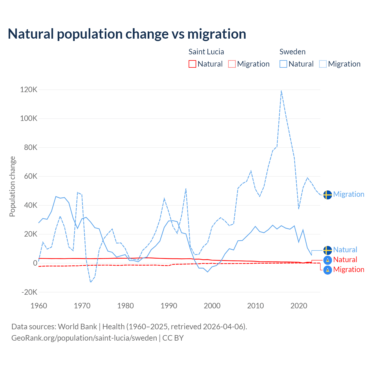 Over the last 10 years, 95.7% of the population change in Saint Lucia is from natural causes (a gain of 6,039 people) and 4.31% is from migration (a loss of 272 people). In Sweden 21.4% is from natural causes (a gain of 201,900 people) and 78.6% is from migration (a gain of 743,642 people).