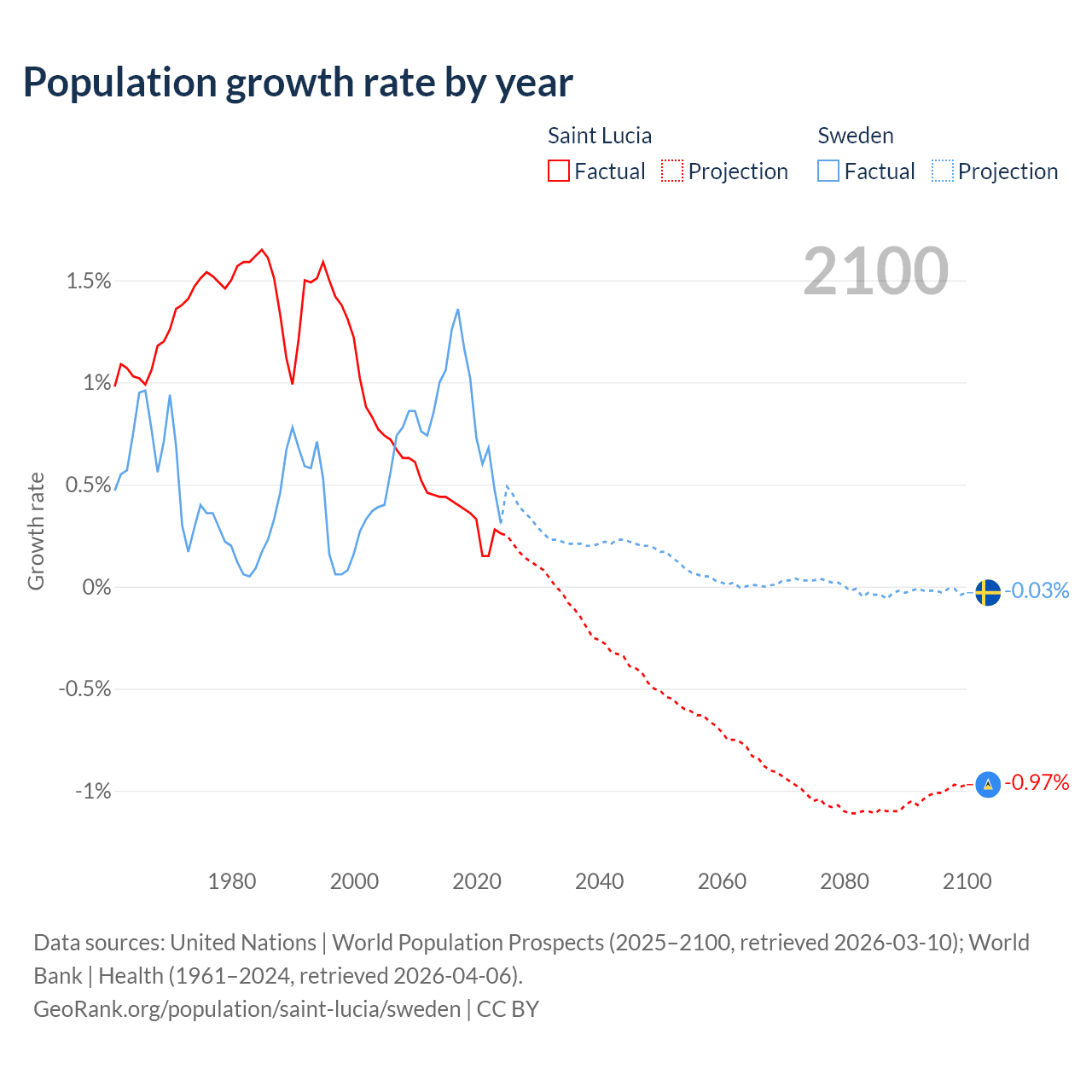 - For the last 10 years, Saint Lucia has had an average growth rate of +0.33% per year vs +0.88% in Sweden.