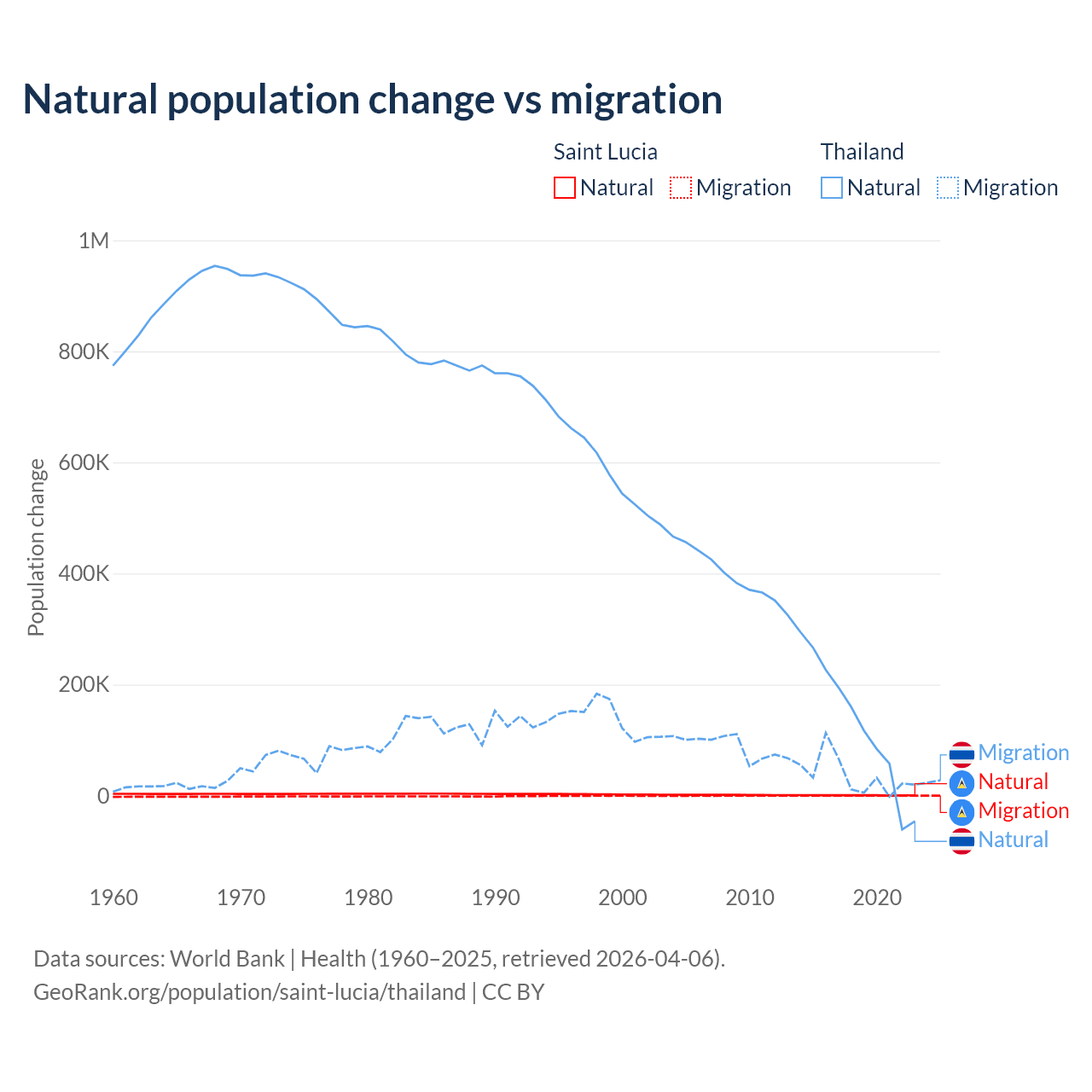 Over the last 10 years, 95.7% of the population change in Saint Lucia is from natural causes (a gain of 6,039 people) and 4.31% is from migration (a loss of 272 people). In Thailand 78.4% is from natural causes (a gain of 1,292,528 people) and 21.6% is from migration (a gain of 355,361 people).