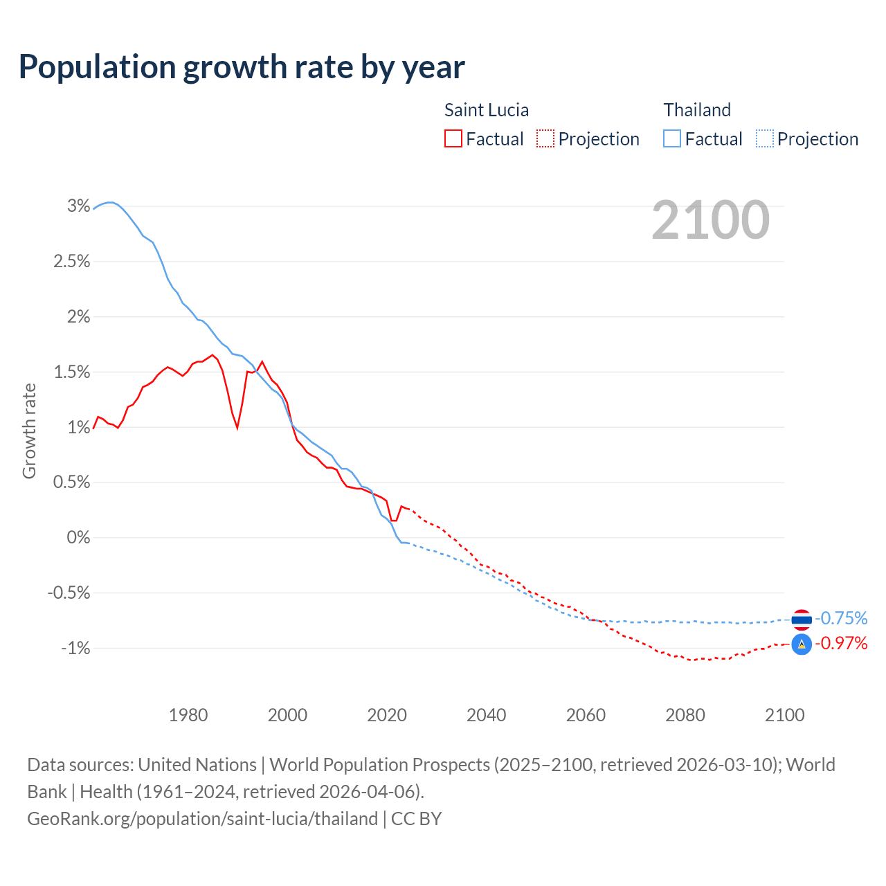 - For the last 10 years, Saint Lucia has had an average growth rate of +0.33% per year vs +0.23% in Thailand.