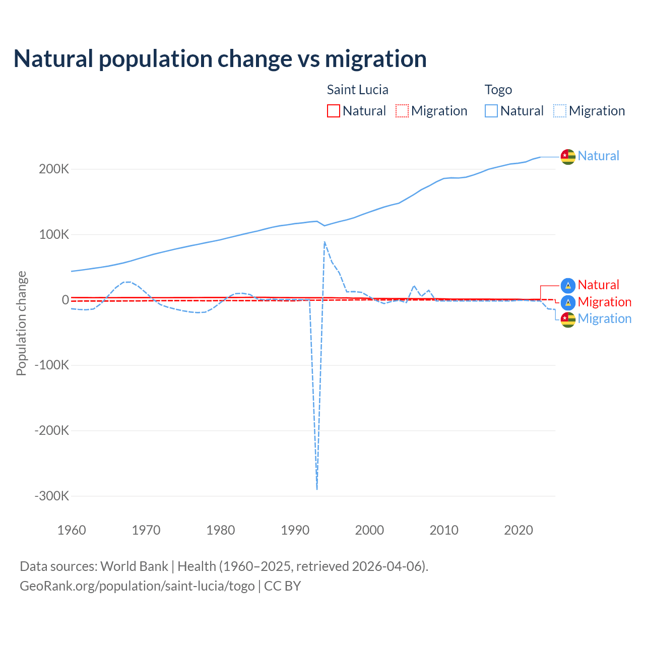 Over the last 10 years, 95.7% of the population change in Saint Lucia is from natural causes (a gain of 6,039 people) and 4.31% is from migration (a loss of 272 people). In Togo 99.1% is from natural causes (a gain of 2,052,115 people) and 0.86% is from migration (a loss of 17,852 people).