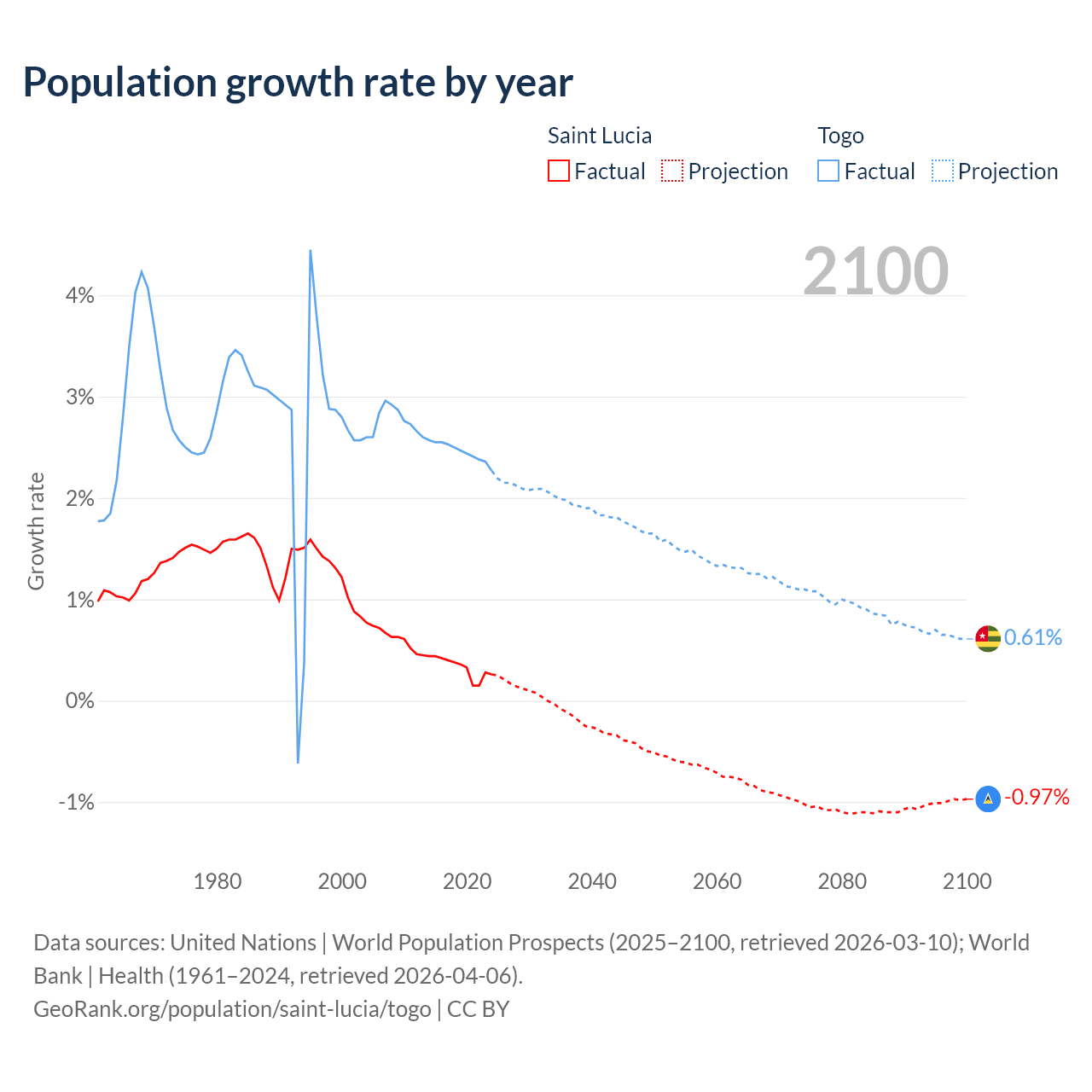 - For the last 10 years, Saint Lucia has had an average growth rate of +0.33% per year vs +2.46% in Togo.