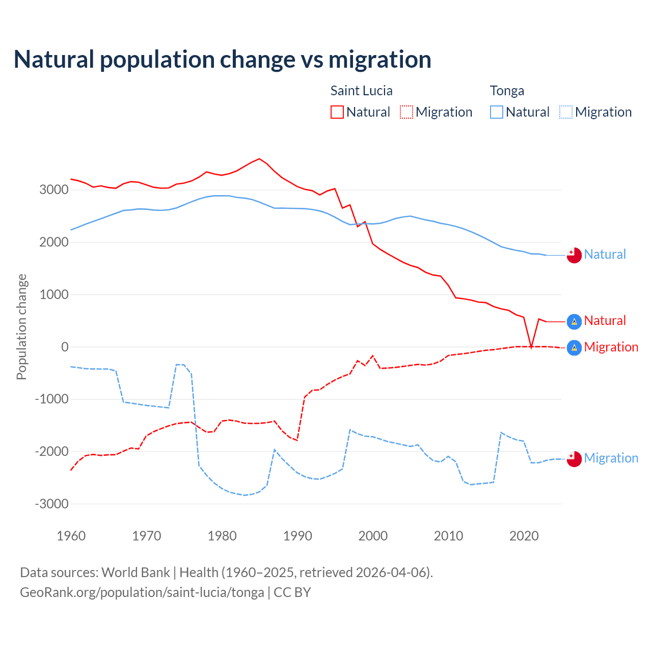 Over the last 10 years, 95.7% of the population change in Saint Lucia is from natural causes (a gain of 6,039 people) and 4.31% is from migration (a loss of 272 people). In Tonga 46.9% is from natural causes (a gain of 18,919 people) and 53.1% is from migration (a loss of 21,384 people).