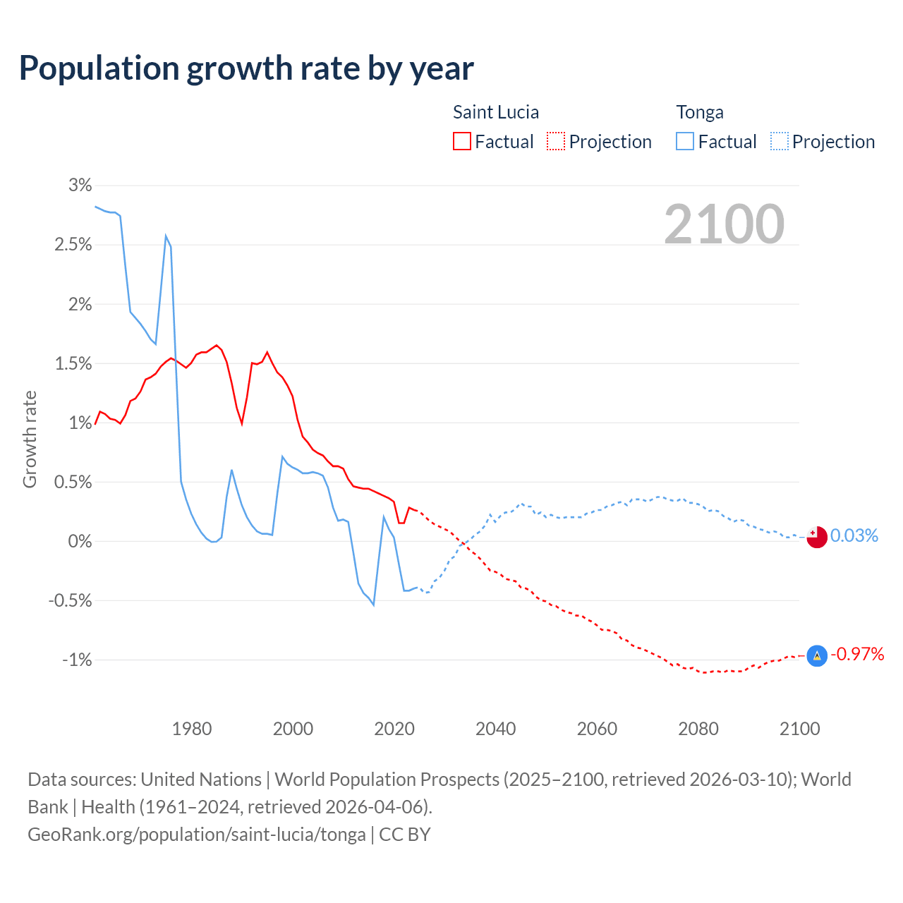 - For the last 10 years, Saint Lucia has had an average growth rate of +0.33% per year vs -0.25% in Tonga.
