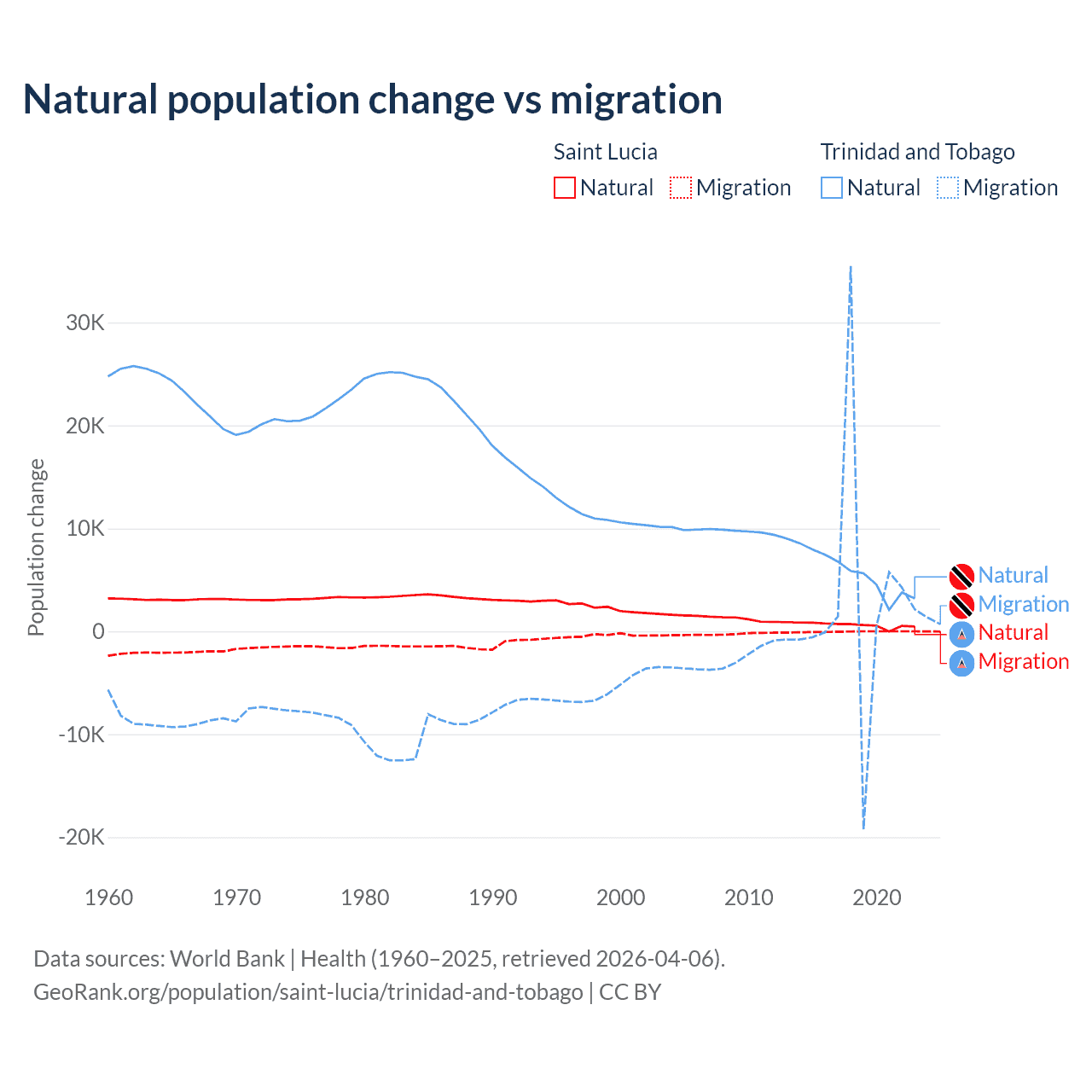 Over the last 10 years, 95.7% of the population change in Saint Lucia is from natural causes (a gain of 6,039 people) and 4.31% is from migration (a loss of 272 people). In Trinidad and Tobago 66% is from natural causes (a gain of 55,887 people) and 34% is from migration (a gain of 28,785 people).