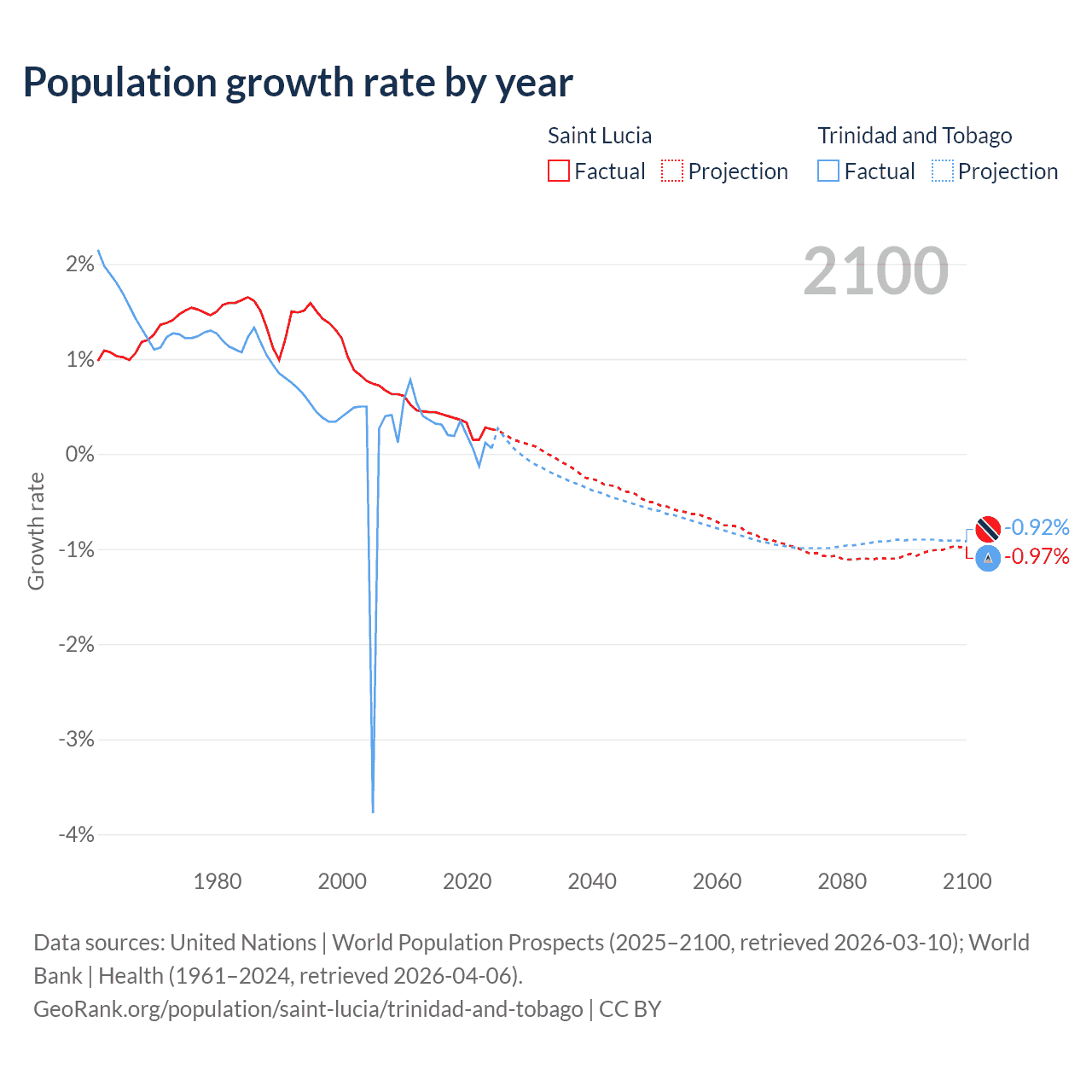 - For the last 10 years, Saint Lucia has had an average growth rate of +0.33% per year vs +0.19% in Trinidad and Tobago.