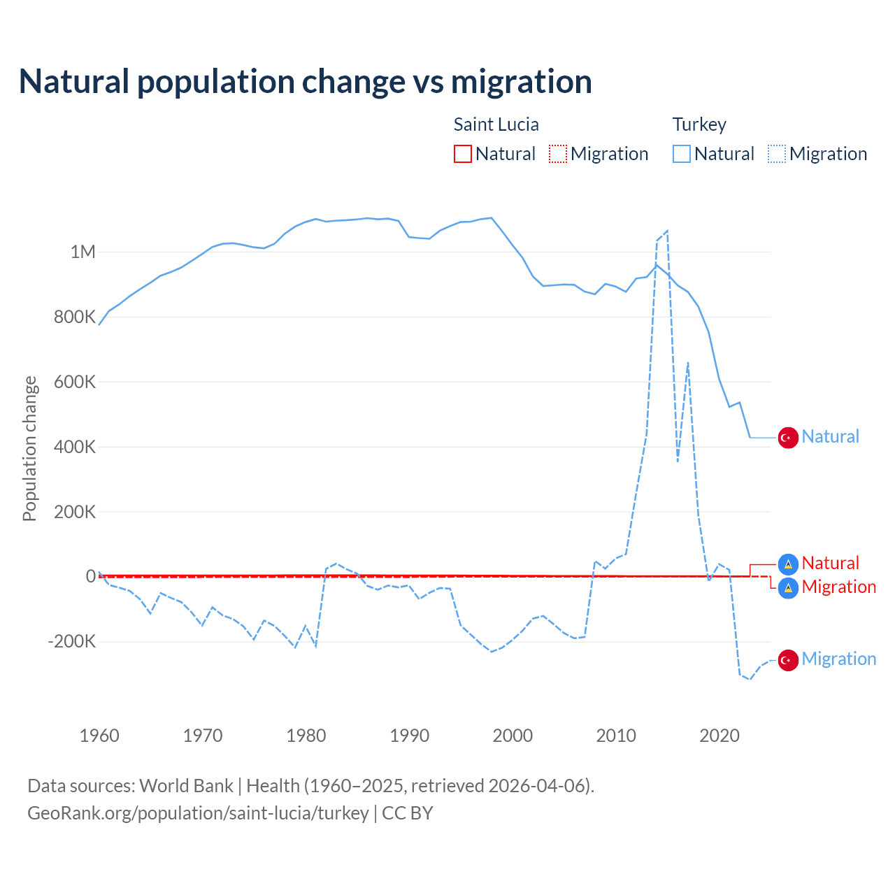 Over the last 10 years, 95.7% of the population change in Saint Lucia is from natural causes (a gain of 6,039 people) and 4.31% is from migration (a loss of 272 people). In Turkey 73% is from natural causes (a gain of 7,333,352 people) and 27% is from migration (a gain of 2,718,916 people).