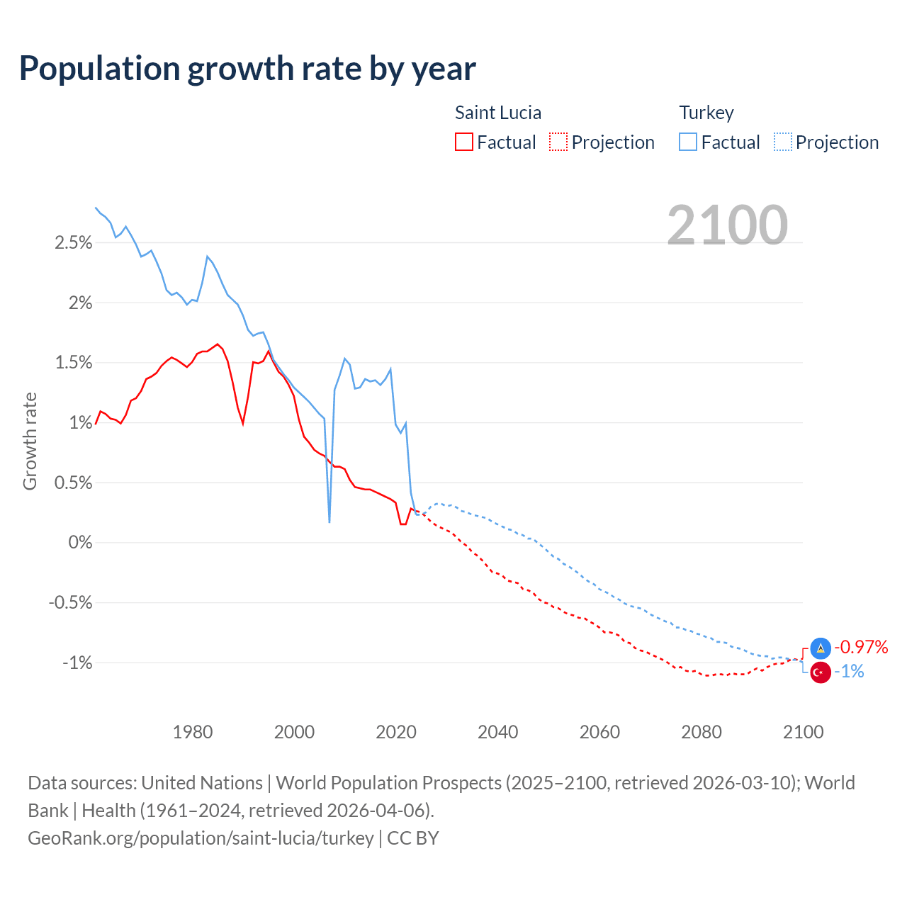 - For the last 10 years, Saint Lucia has had an average growth rate of +0.33% per year vs +1.06% in Turkey.