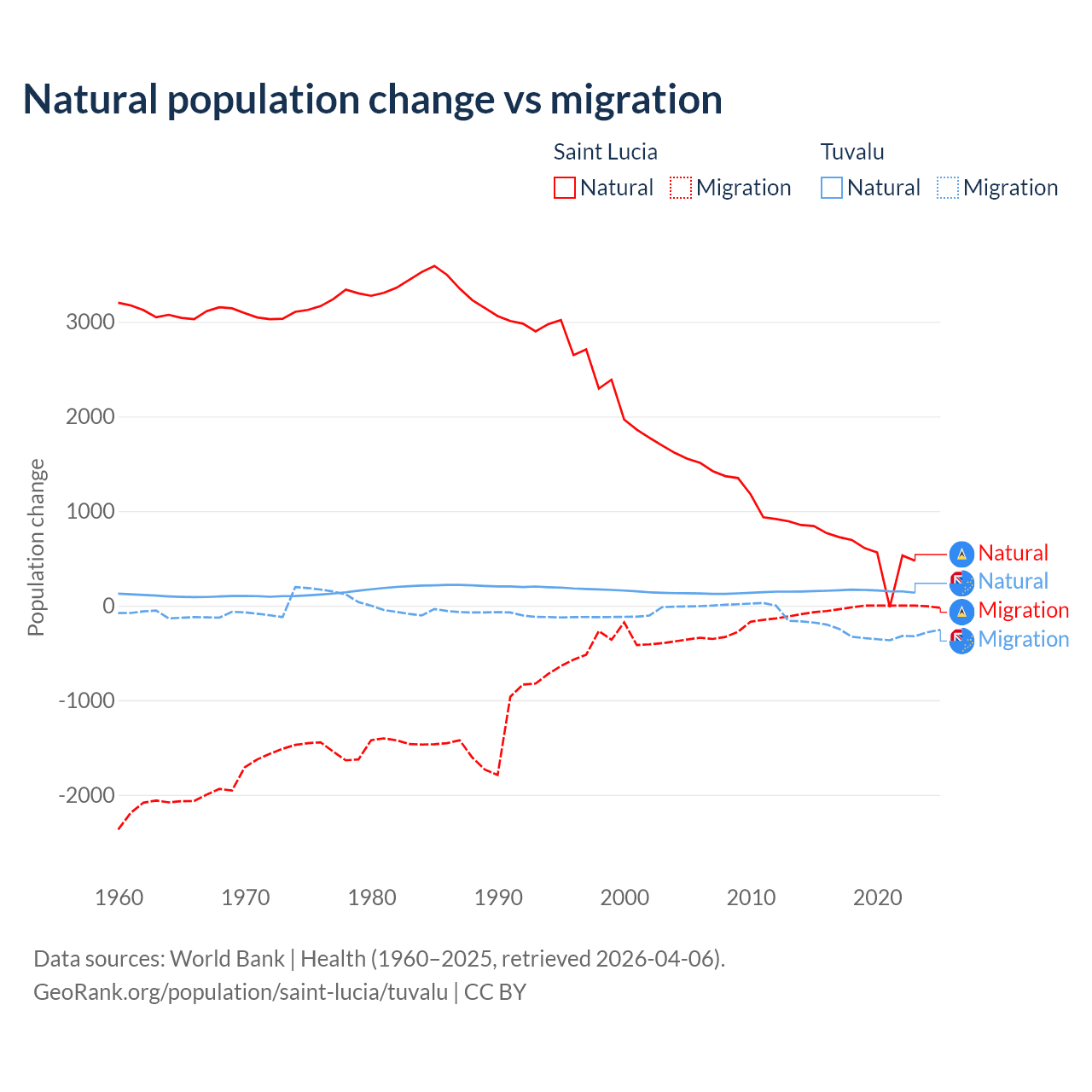 Over the last 10 years, 95.7% of the population change in Saint Lucia is from natural causes (a gain of 6,039 people) and 4.31% is from migration (a loss of 272 people). In Tuvalu 35.5% is from natural causes (a gain of 1,556 people) and 64.5% is from migration (a loss of 2,827 people).