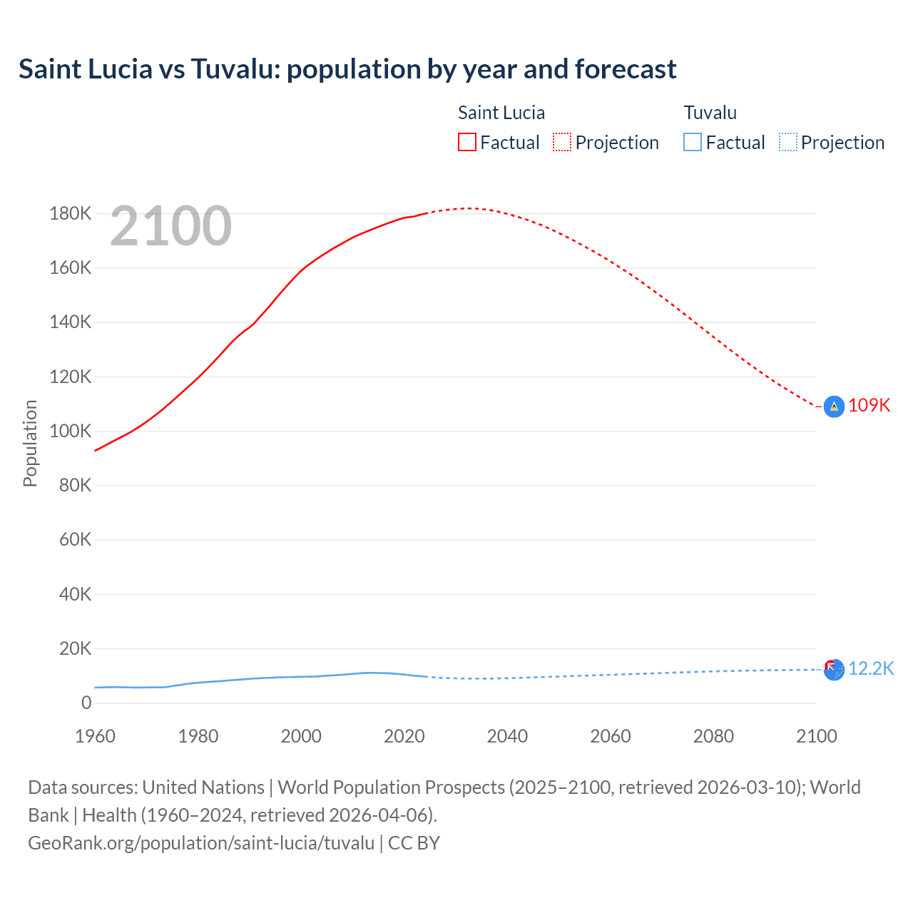 The latest officially reported population of Saint Lucia was 179,744 in 2024 vs 9,646 people in Tuvalu in 2024. In 2026, based on the adjusted UN estimation, the current Saint Lucia's population is 180,638 people compared to 9,341 in Tuvalu.