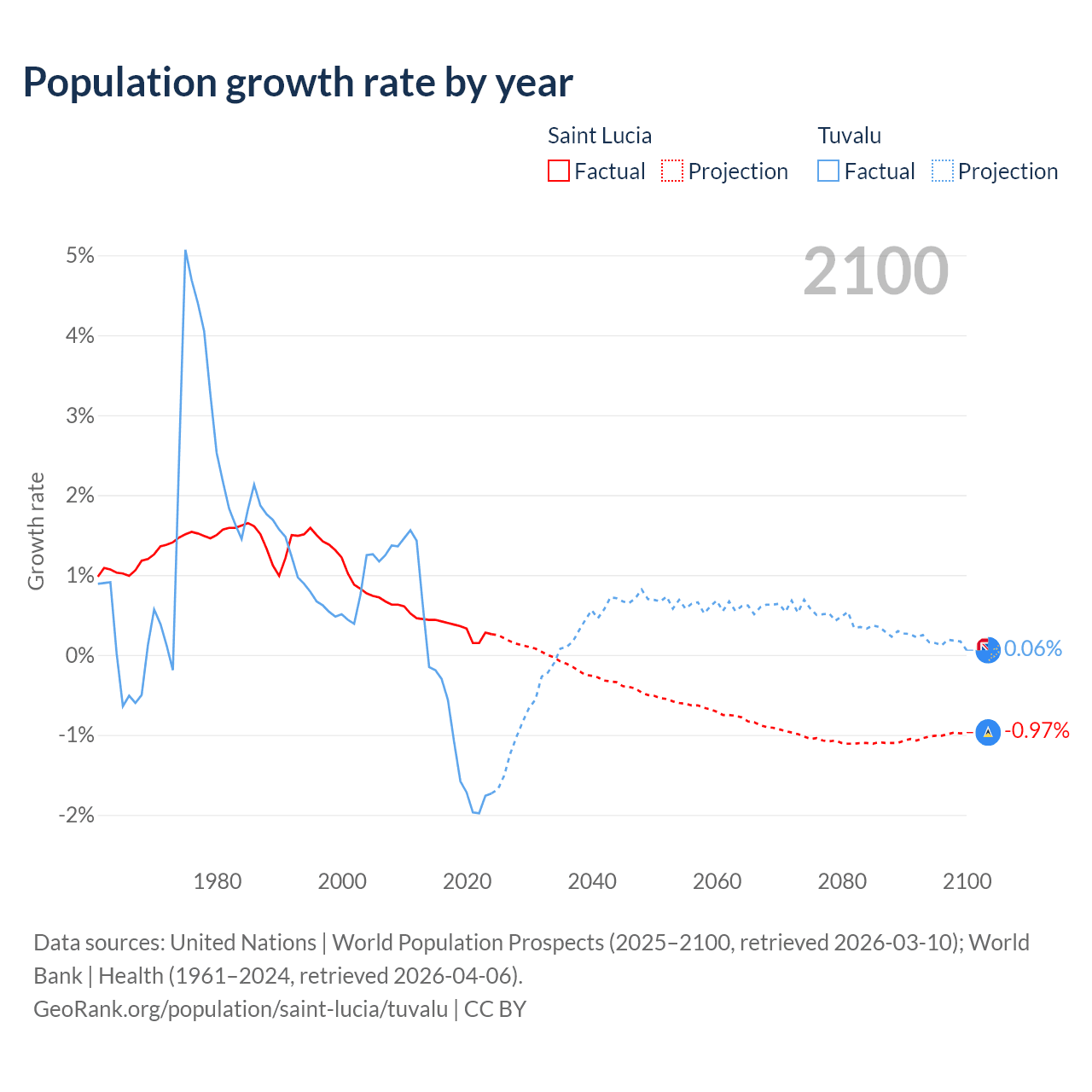 - For the last 10 years, Saint Lucia has had an average growth rate of +0.33% per year vs -1.19% in Tuvalu.