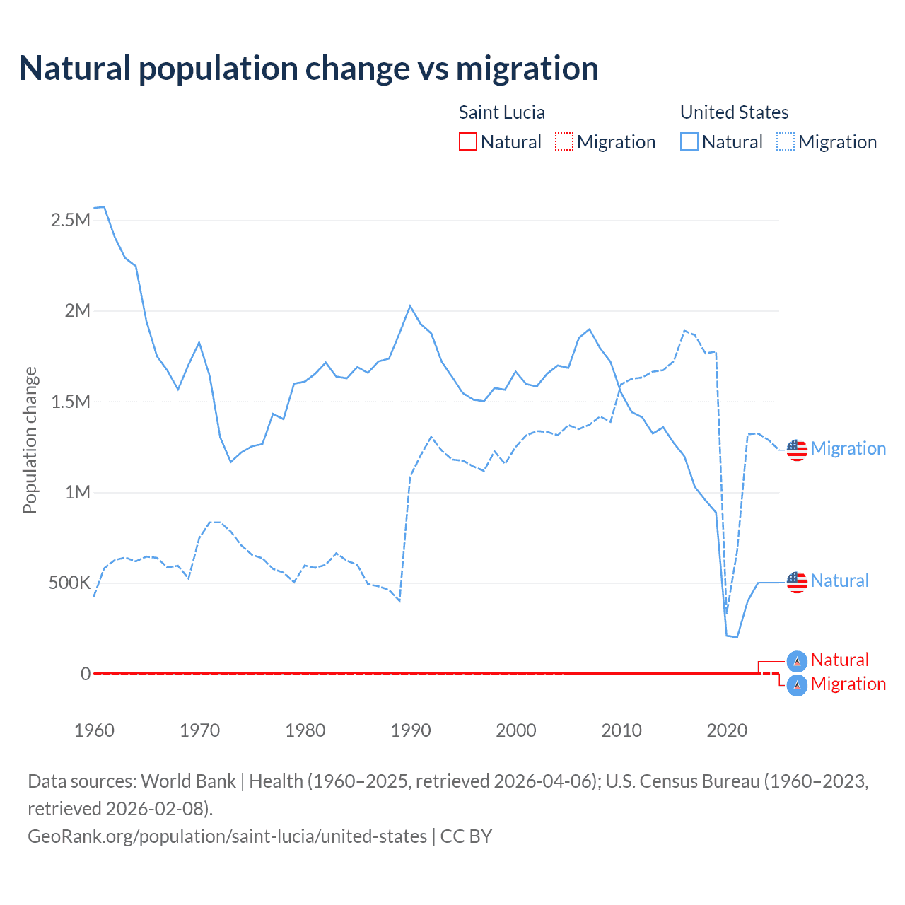 Over the last 10 years, 95.7% of the population change in Saint Lucia is from natural causes (a gain of 6,039 people) and 4.31% is from migration (a loss of 272 people). In the United States 35.8% is from natural causes (a gain of 8,005,866 people) and 64.2% is from migration (a gain of 14,334,286 people).