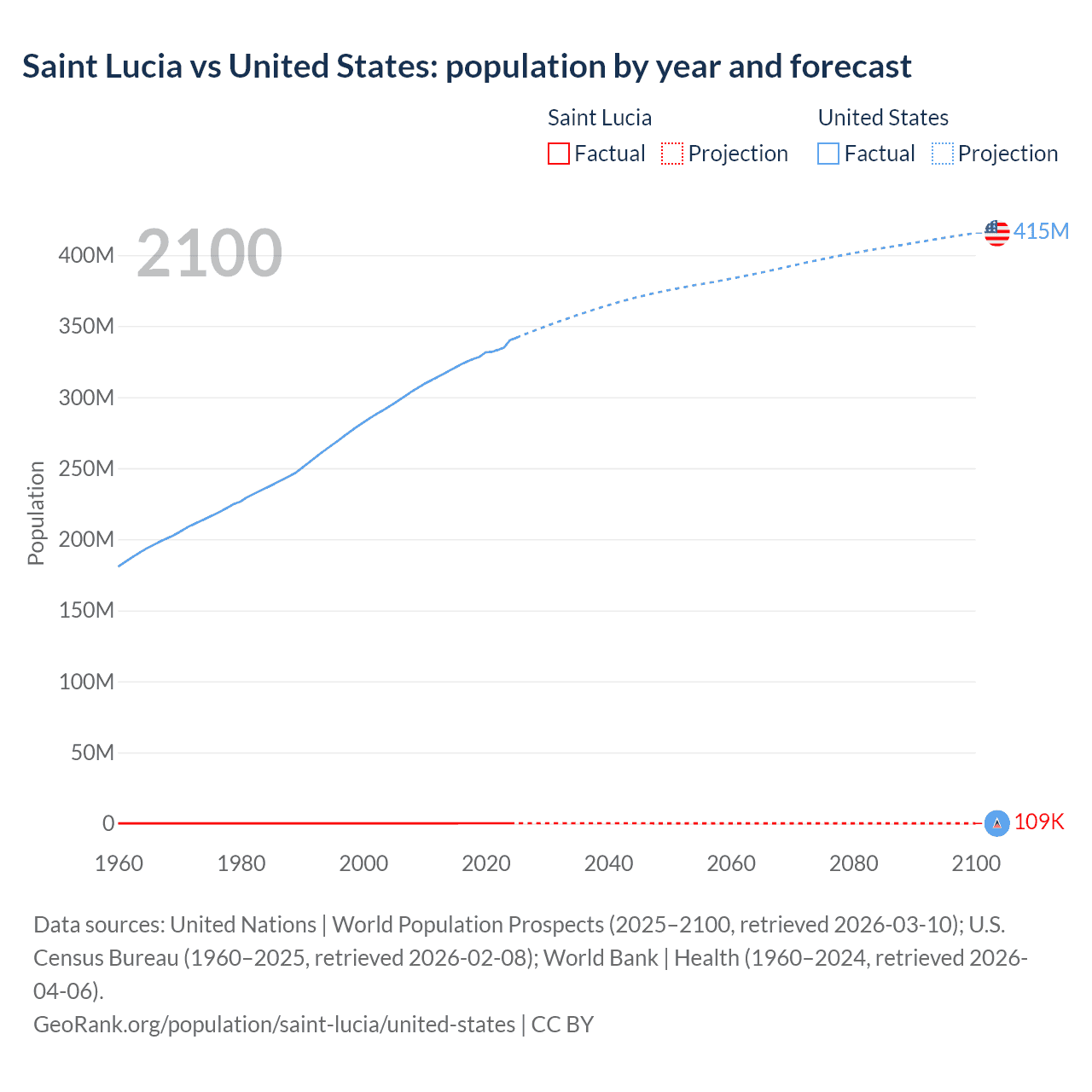 - Since 2006, the population of Saint Lucia has increased from 167K people to 181K (8.4% growth), while the United States has grown from 298M to 344M (15.3% growth).