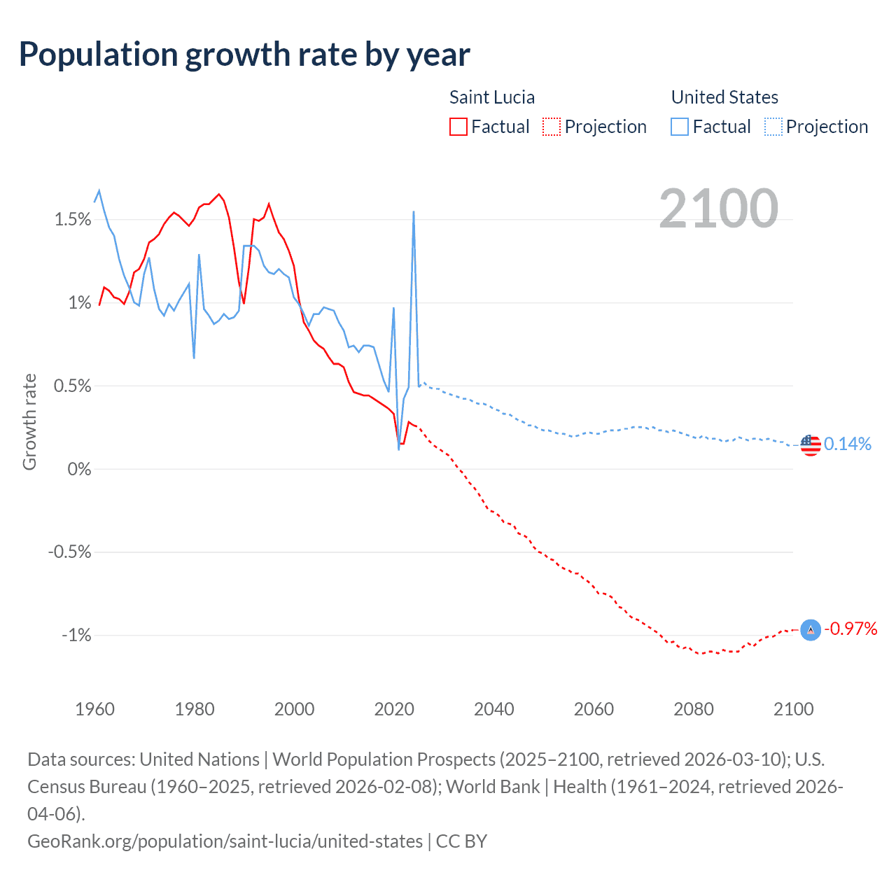 - For the last 10 years, Saint Lucia has had an average growth rate of +0.33% per year vs +0.65% in the United States.