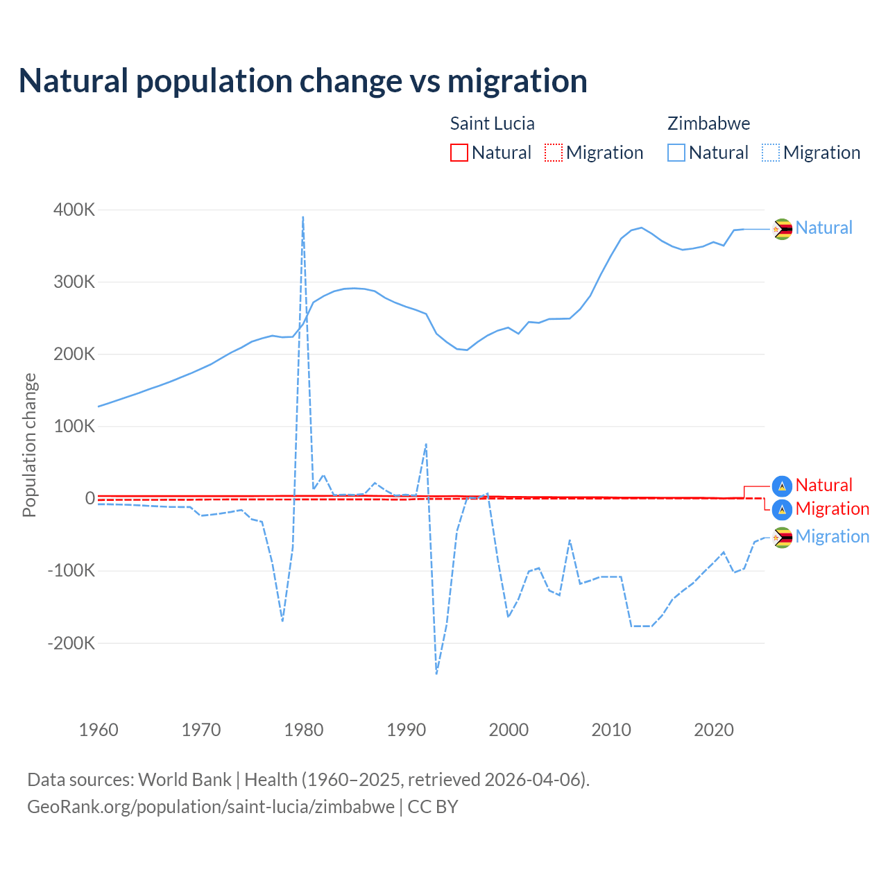 Over the last 10 years, 95.7% of the population change in Saint Lucia is from natural causes (a gain of 6,039 people) and 4.31% is from migration (a loss of 272 people). In Zimbabwe 74.9% is from natural causes (a gain of 3,558,487 people) and 25.1% is from migration (a loss of 1,192,807 people).