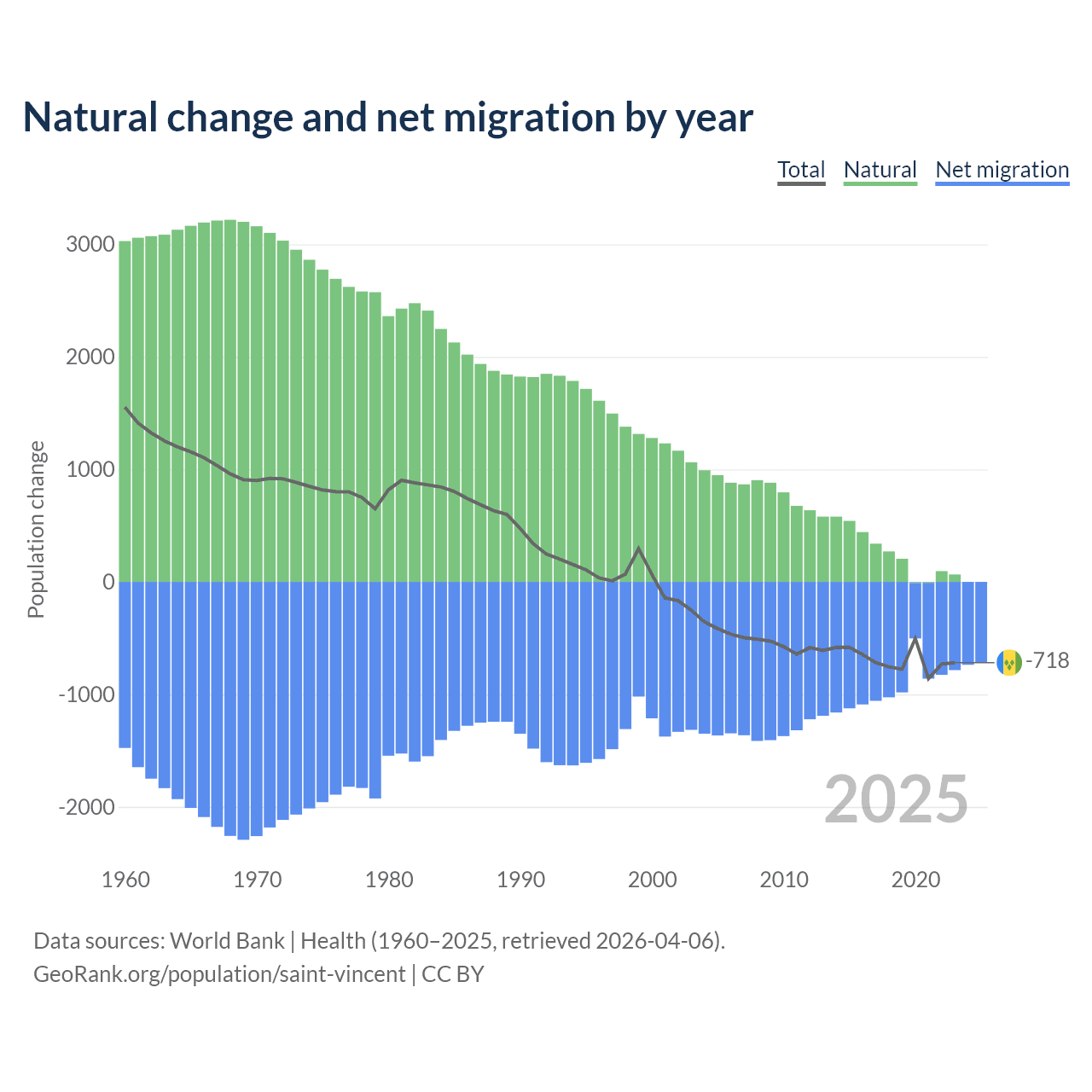 Over the last 10 years, 21.2% of the population change in Saint Vincent is from natural causes (a gain of 2,525 people) and 78.8% is from migration (a loss of 9,393 people).