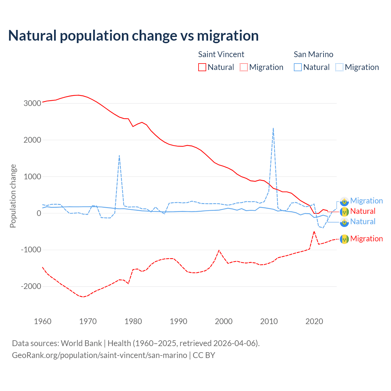 Over the last 10 years, 21.2% of the population change in Saint Vincent is from natural causes (a gain of 2,525 people) and 78.8% is from migration (a loss of 9,393 people). In San Marino 40.9% is from natural causes (a loss of 358 people) and 59.1% is from migration (a gain of 517 people).