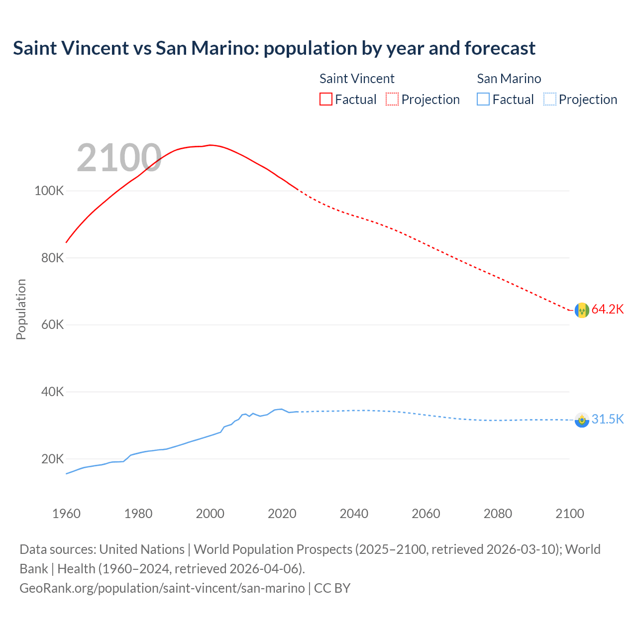 The latest officially reported population of Saint Vincent was 100,616 in 2024 vs 33,977 people in San Marino in 2024. In 2026, based on the adjusted UN estimation, the current Saint Vincent's population is 99,237 people compared to 33,967 in San Marino.
