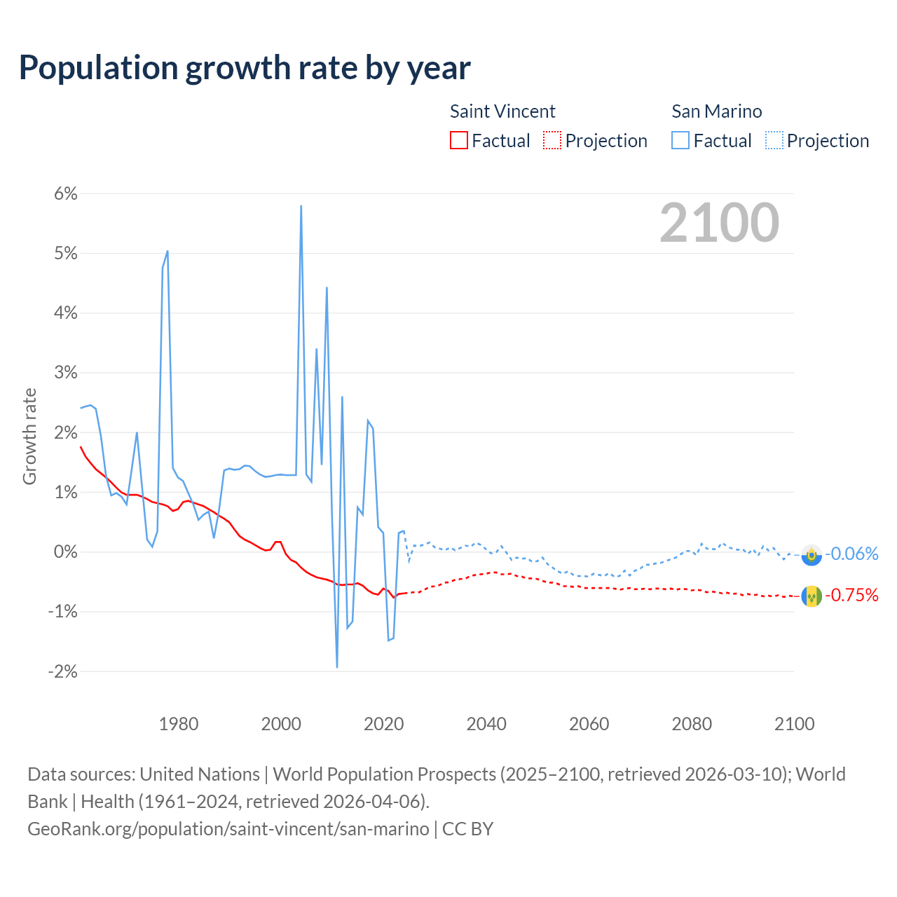 - For the last 10 years, Saint Vincent has had an average growth rate of -0.65% per year vs +0.26% in San Marino.