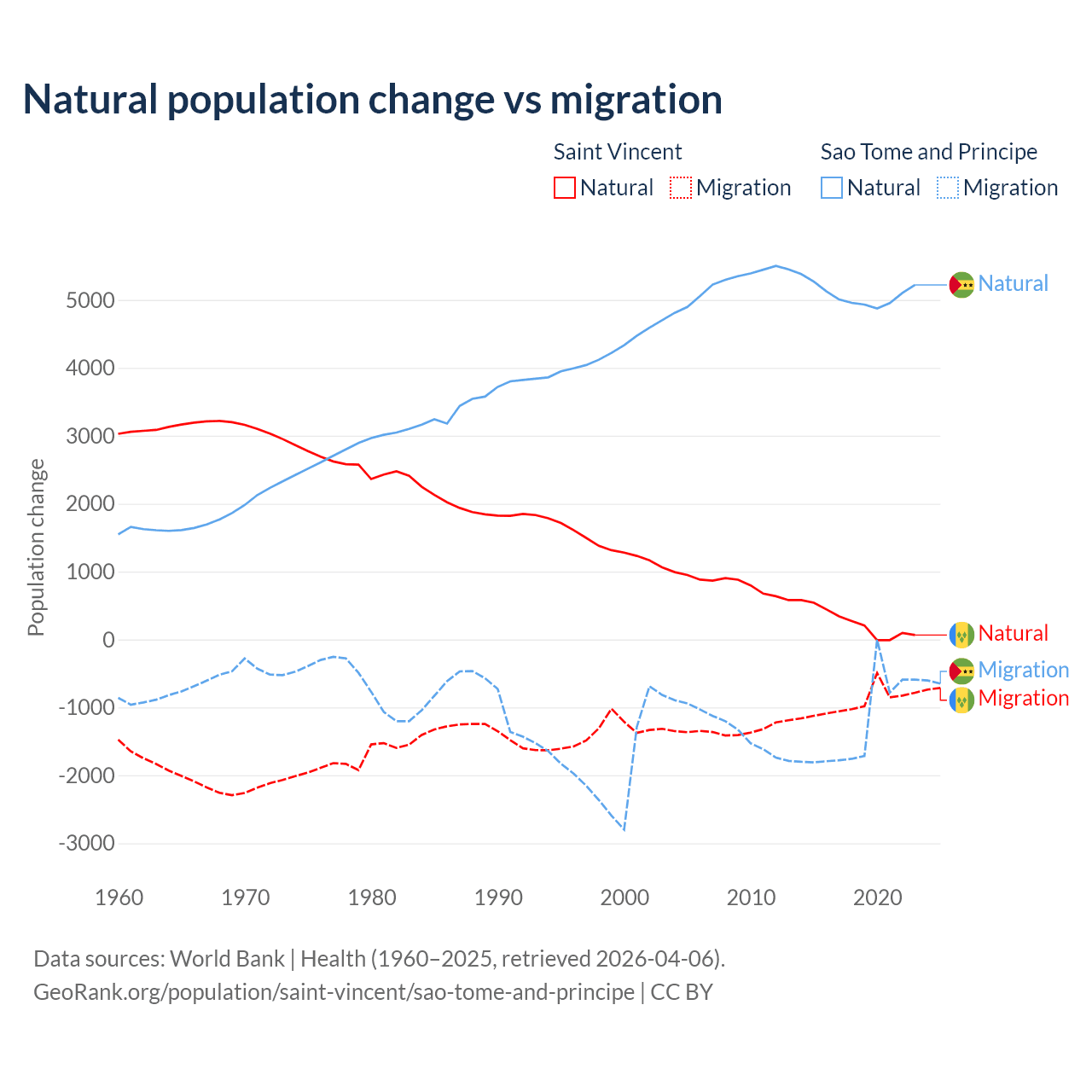 Over the last 10 years, 21.2% of the population change in Saint Vincent is from natural causes (a gain of 2,525 people) and 78.8% is from migration (a loss of 9,393 people). In Sao Tome and Principe 80.1% is from natural causes (a gain of 50,822 people) and 19.9% is from migration (a loss of 12,621 people).
