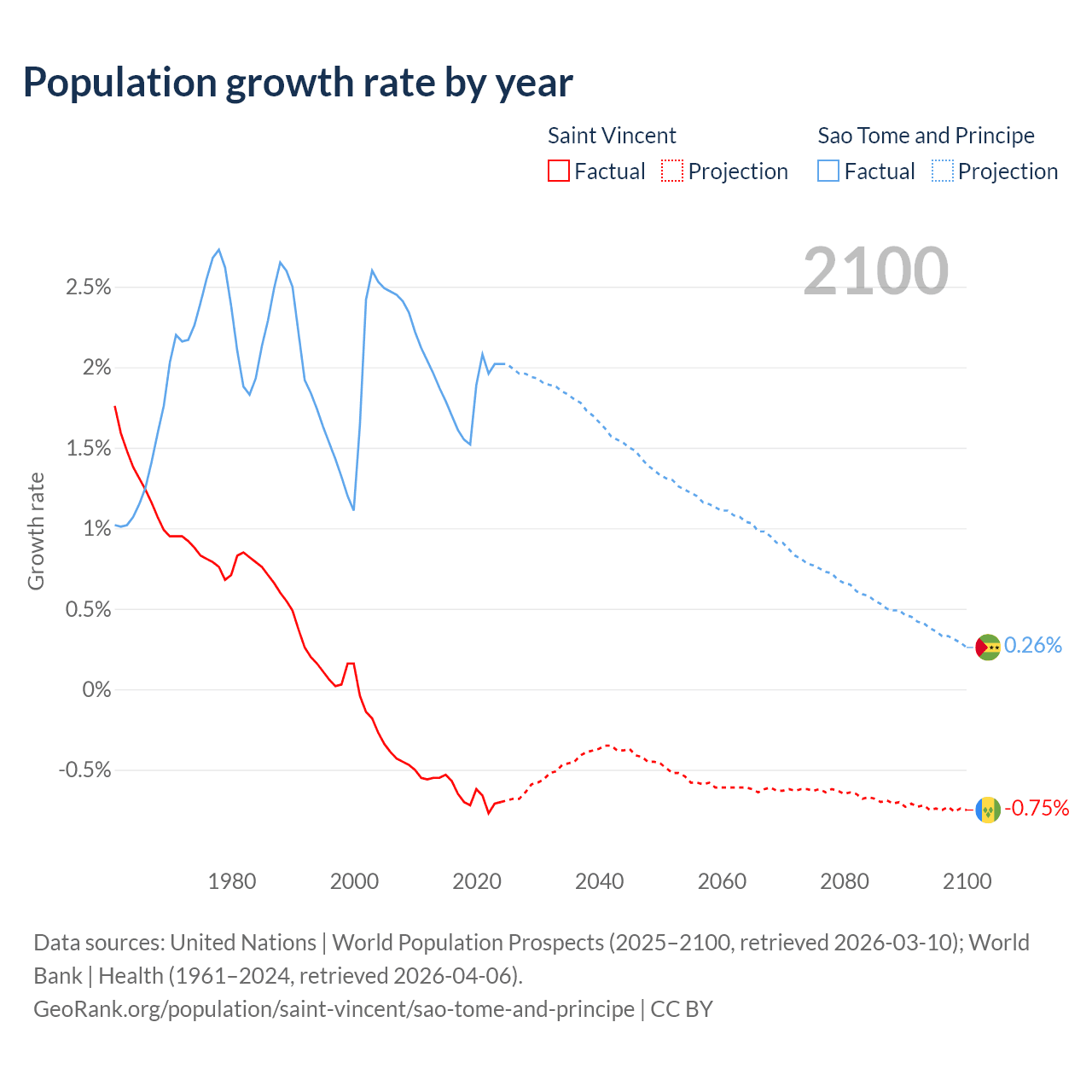 - For the last 10 years, Saint Vincent has had an average growth rate of -0.65% per year vs +1.82% in Sao Tome and Principe.