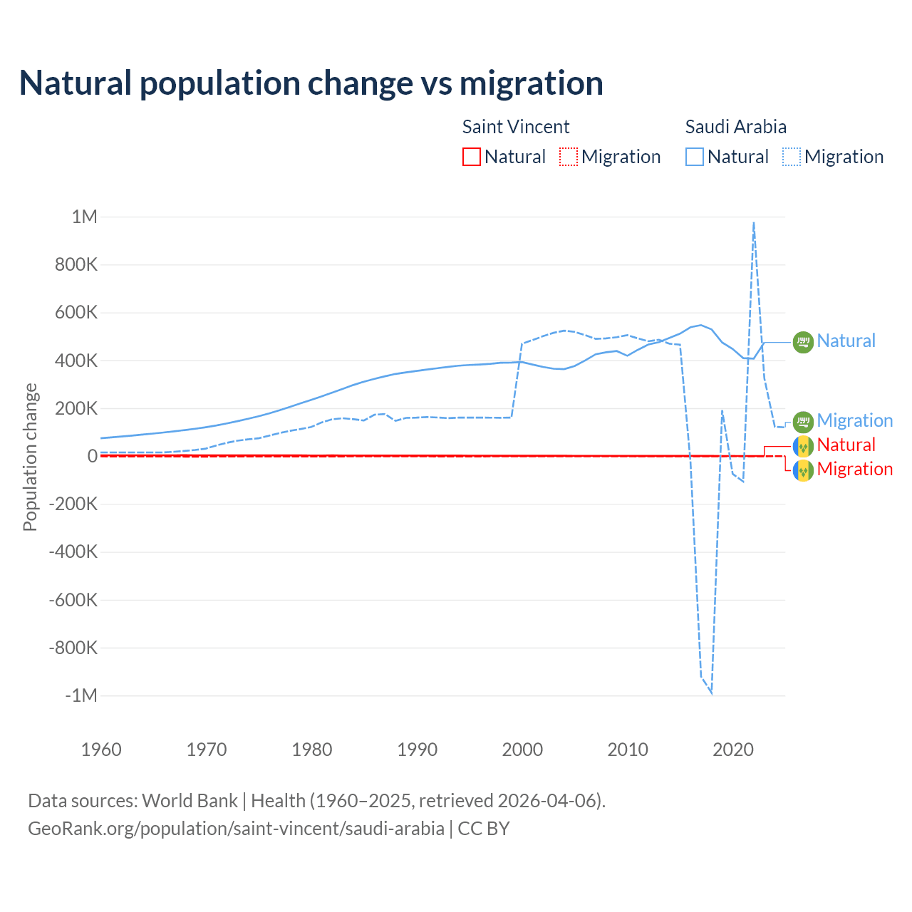 Over the last 10 years, 21.2% of the population change in Saint Vincent is from natural causes (a gain of 2,525 people) and 78.8% is from migration (a loss of 9,393 people). In Saudi Arabia 93.9% is from natural causes (a gain of 4,829,562 people) and 6.05% is from migration (a gain of 311,209 people).