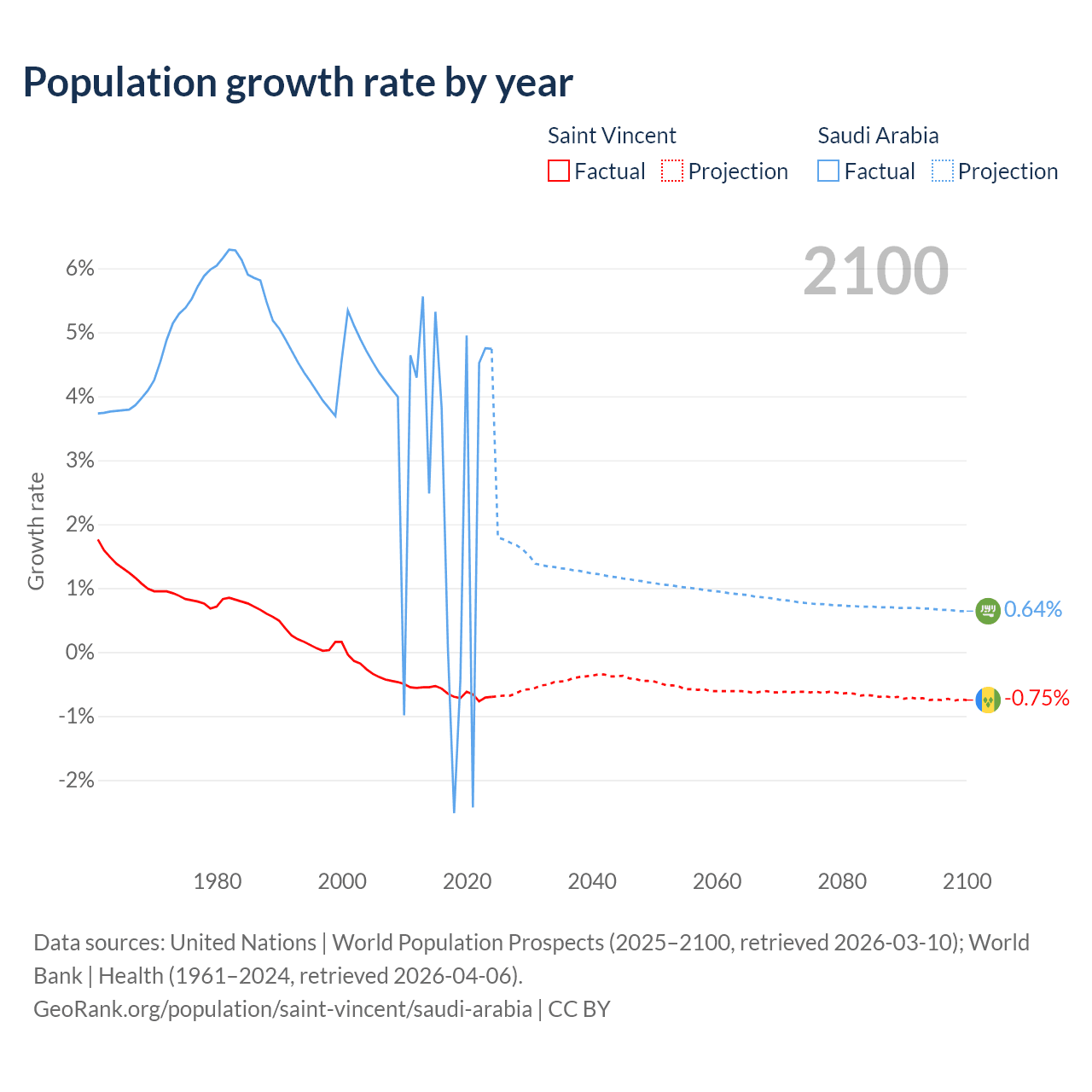 - For the last 10 years, Saint Vincent has had an average growth rate of -0.65% per year vs +2.3% in Saudi Arabia.