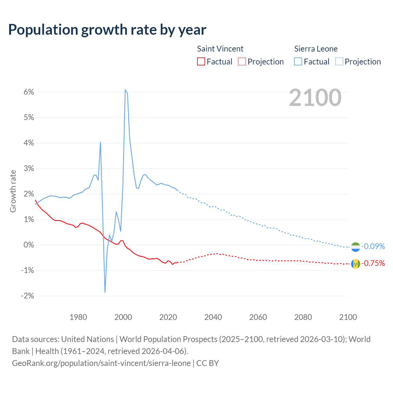- For the last 10 years, Saint Vincent has had an average growth rate of -0.65% per year vs +2.32% in Sierra Leone.