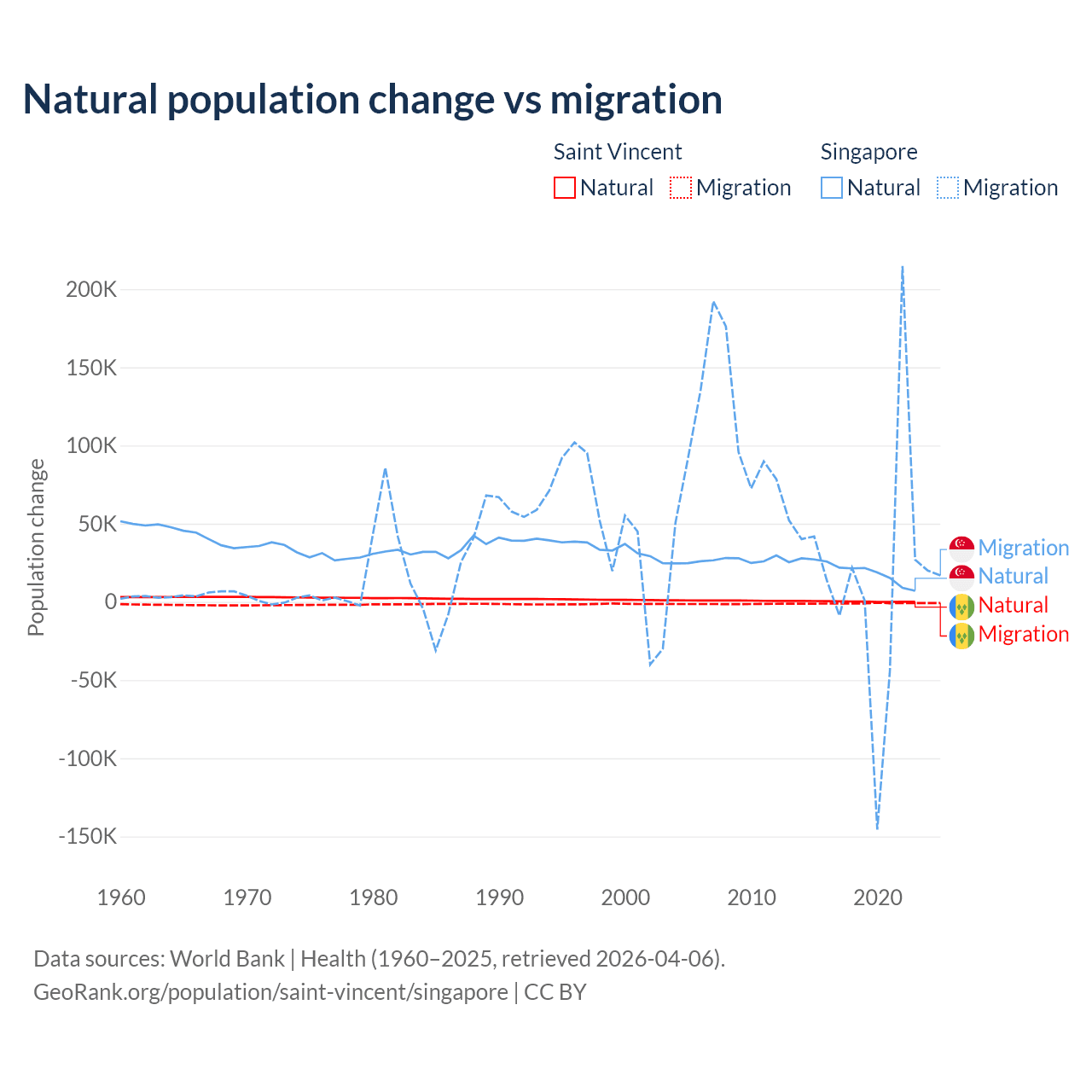 Over the last 10 years, 21.2% of the population change in Saint Vincent is from natural causes (a gain of 2,525 people) and 78.8% is from migration (a loss of 9,393 people). In Singapore 54.8% is from natural causes (a gain of 195,953 people) and 45.2% is from migration (a gain of 161,805 people).