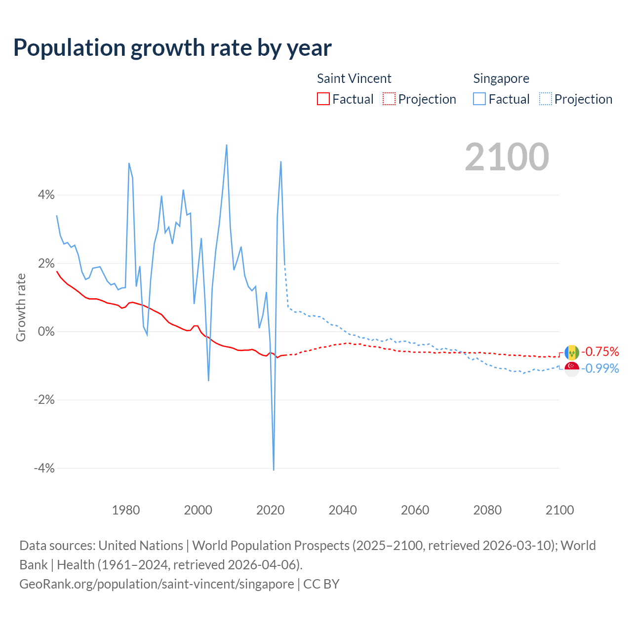 - For the last 10 years, Saint Vincent has had an average growth rate of -0.65% per year vs +1.04% in Singapore.