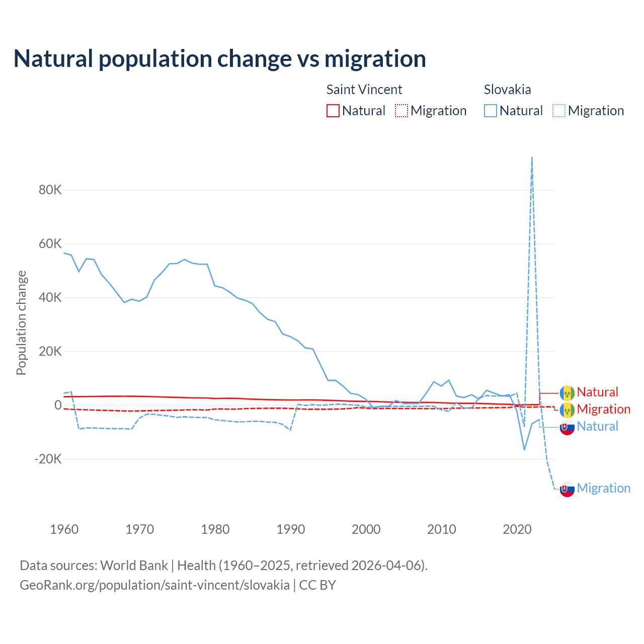 Over the last 10 years, 21.2% of the population change in Saint Vincent is from natural causes (a gain of 2,525 people) and 78.8% is from migration (a loss of 9,393 people). In Slovakia 7.47% is from natural causes (a loss of 8,728 people) and 92.5% is from migration (a gain of 108,156 people).