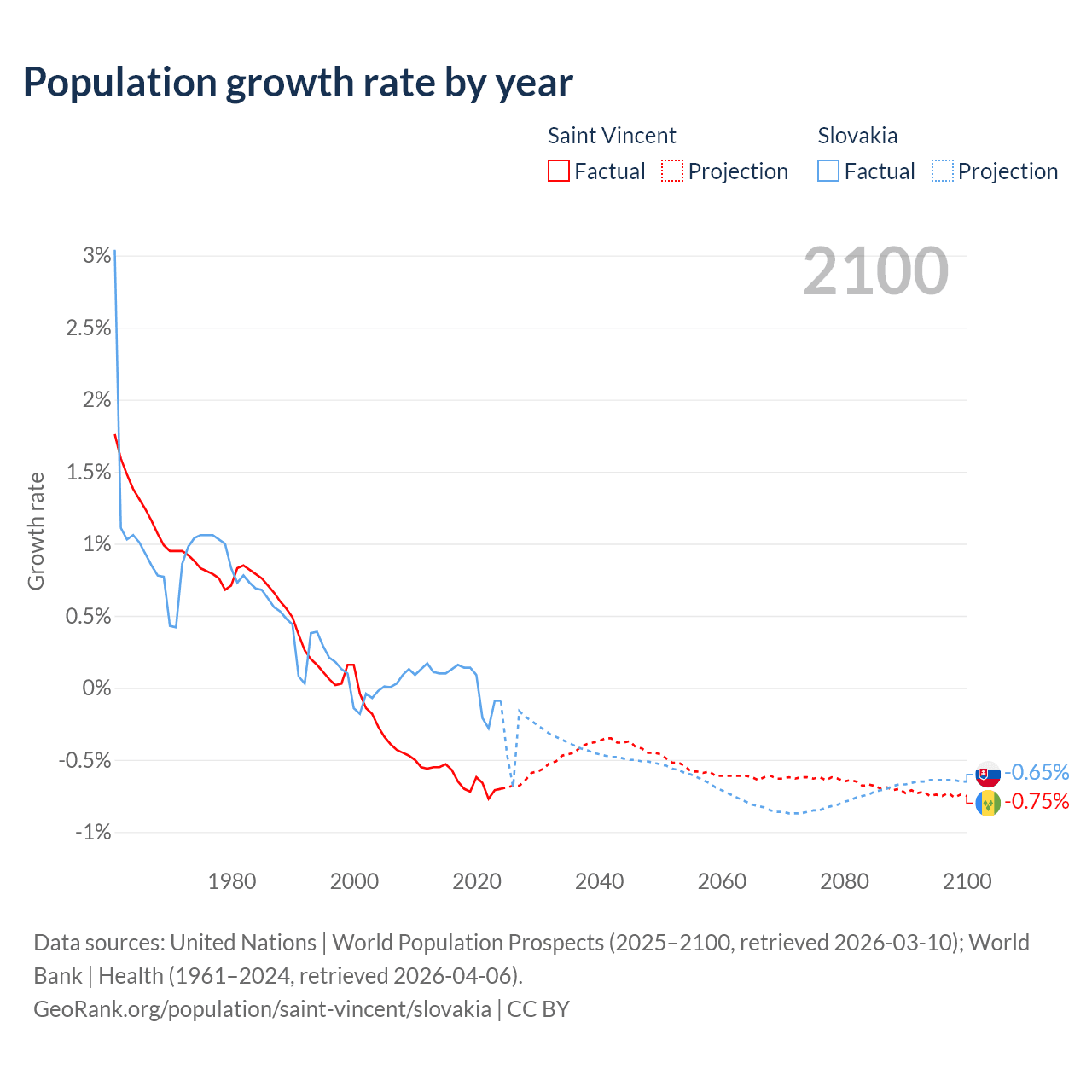 - For the last 10 years, Saint Vincent has had an average growth rate of -0.65% per year vs +0.01% in Slovakia.