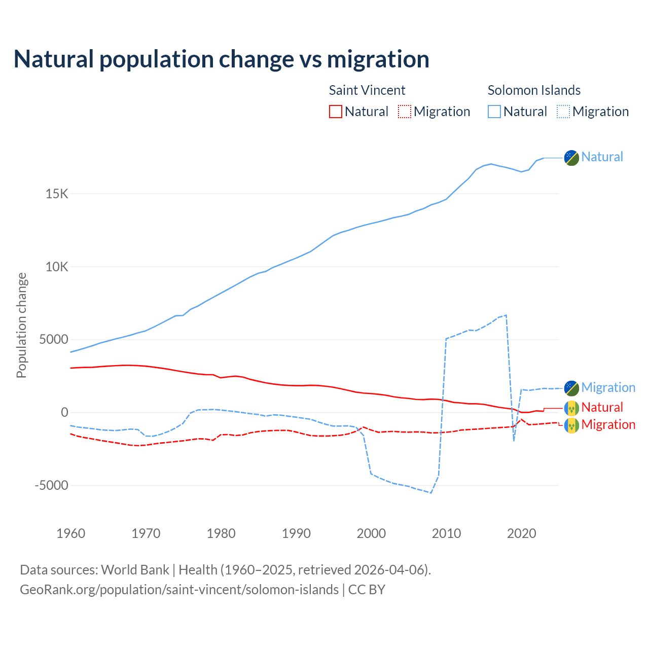 Over the last 10 years, 21.2% of the population change in Saint Vincent is from natural causes (a gain of 2,525 people) and 78.8% is from migration (a loss of 9,393 people). In the Solomon Islands 82.8% is from natural causes (a gain of 168,727 people) and 17.2% is from migration (a gain of 35,031 people).