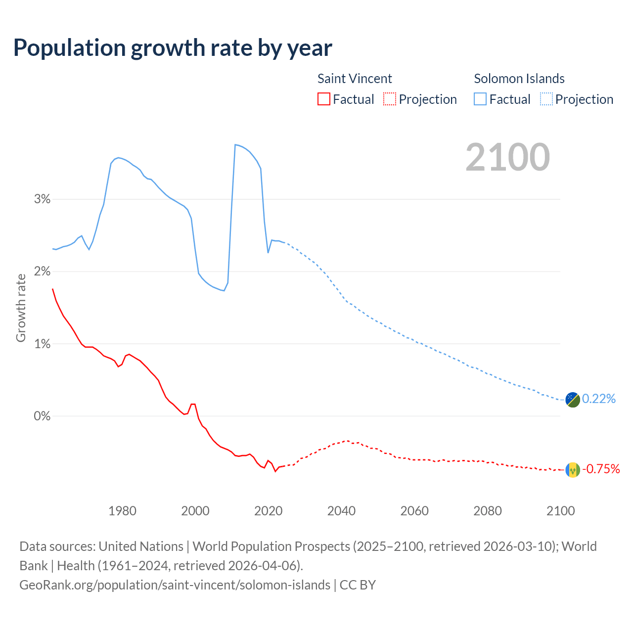 - For the last 10 years, Saint Vincent has had an average growth rate of -0.65% per year vs +2.95% in the Solomon Islands.