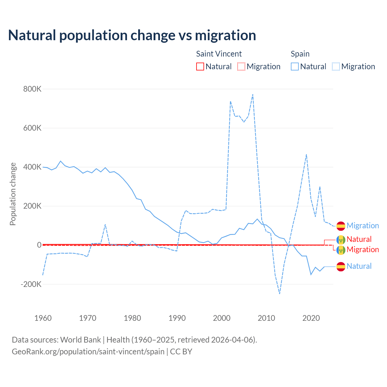 Over the last 10 years, 21.2% of the population change in Saint Vincent is from natural causes (a gain of 2,525 people) and 78.8% is from migration (a loss of 9,393 people). In Spain 25.8% is from natural causes (a loss of 627,829 people) and 74.2% is from migration (a gain of 1,810,127 people).