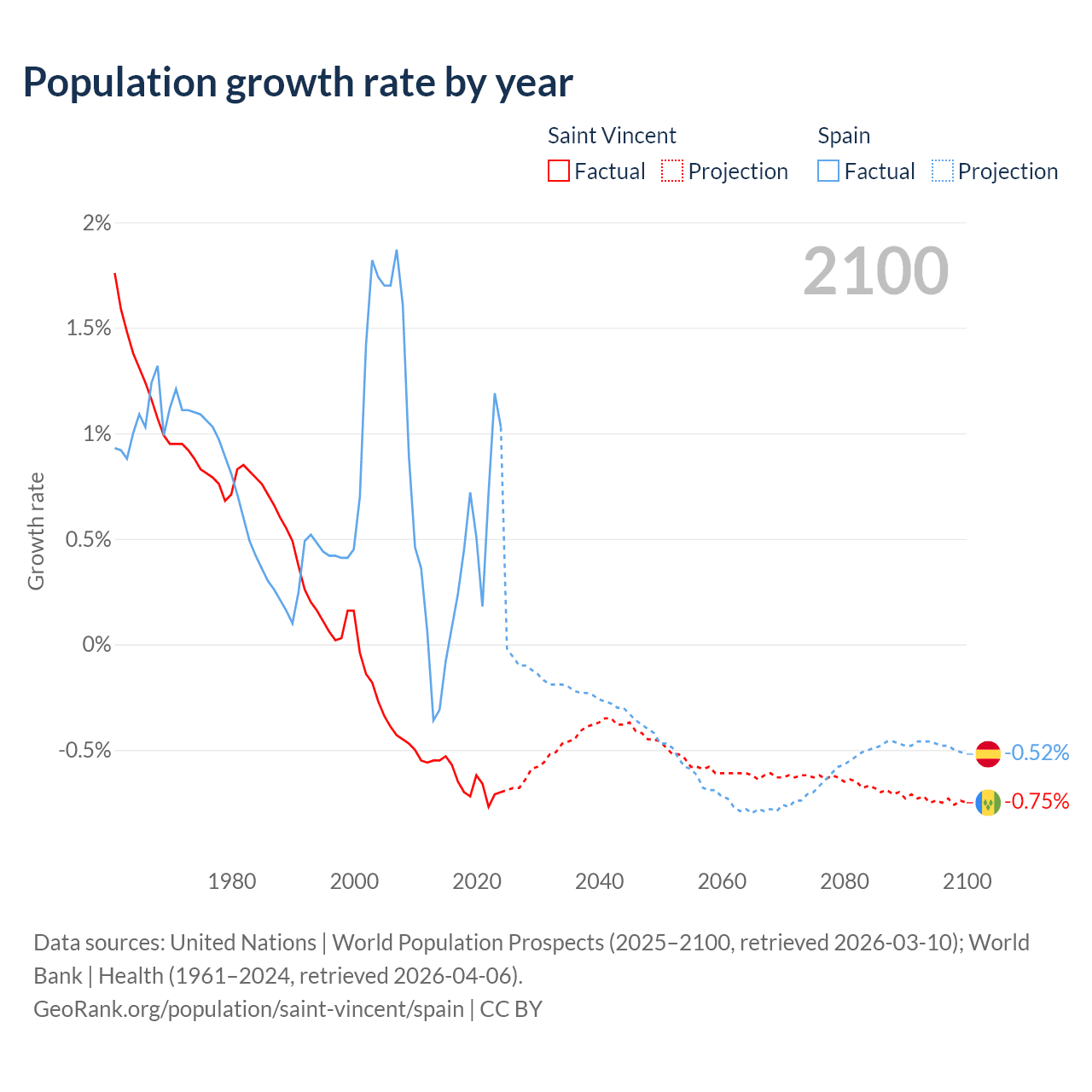 - For the last 10 years, Saint Vincent has had an average growth rate of -0.65% per year vs +0.43% in Spain.