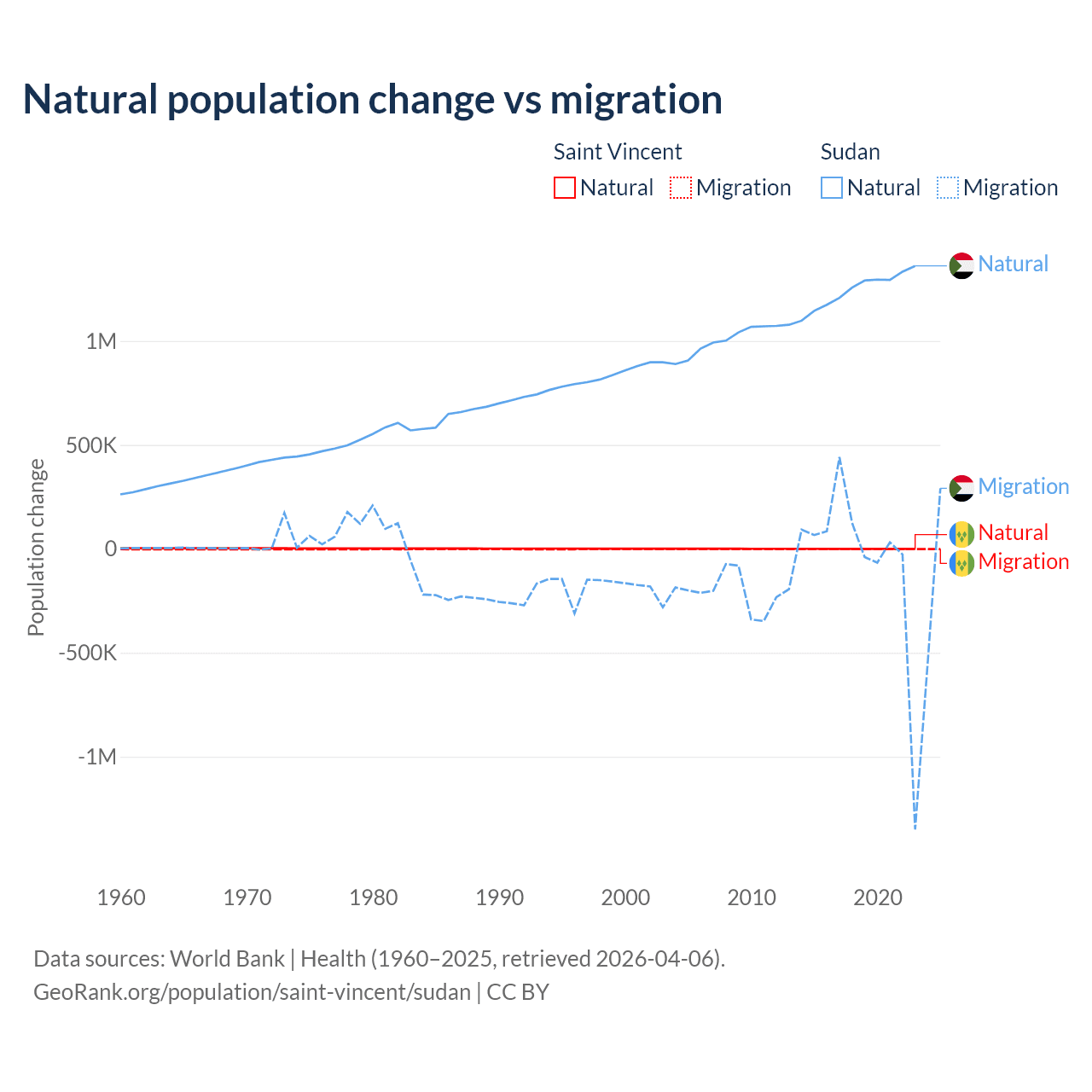 Over the last 10 years, 21.2% of the population change in Saint Vincent is from natural causes (a gain of 2,525 people) and 78.8% is from migration (a loss of 9,393 people). In Sudan 95.1% is from natural causes (a gain of 12,459,977 people) and 4.88% is from migration (a loss of 639,596 people).