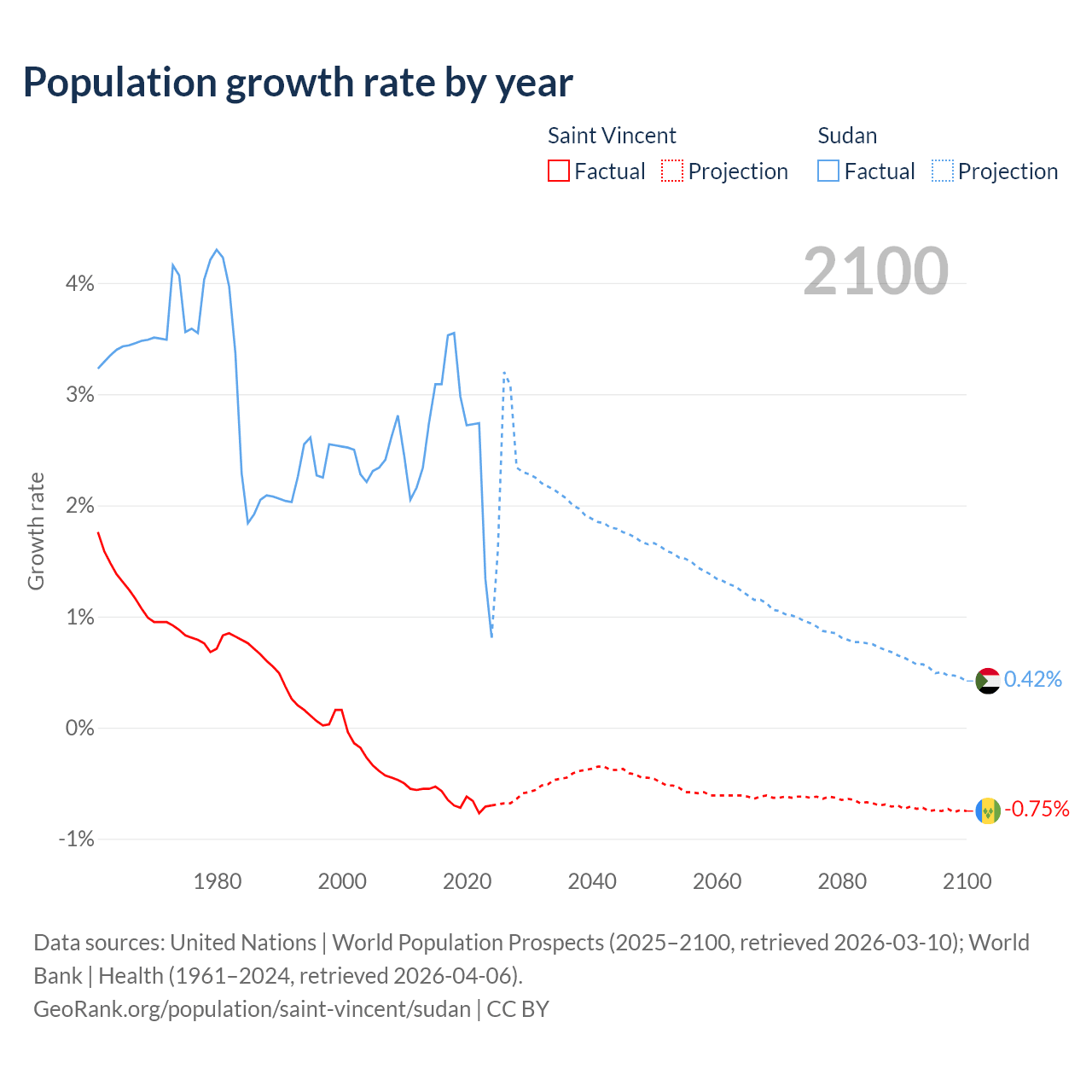 - For the last 10 years, Saint Vincent has had an average growth rate of -0.65% per year vs +2.67% in Sudan.