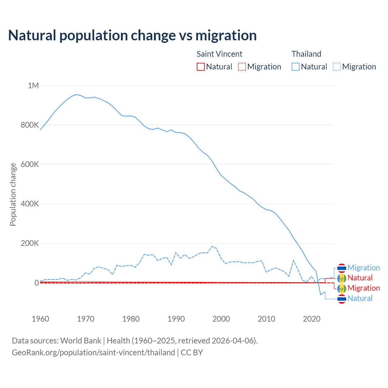 Over the last 10 years, 21.2% of the population change in Saint Vincent is from natural causes (a gain of 2,525 people) and 78.8% is from migration (a loss of 9,393 people). In Thailand 78.4% is from natural causes (a gain of 1,292,528 people) and 21.6% is from migration (a gain of 355,361 people).