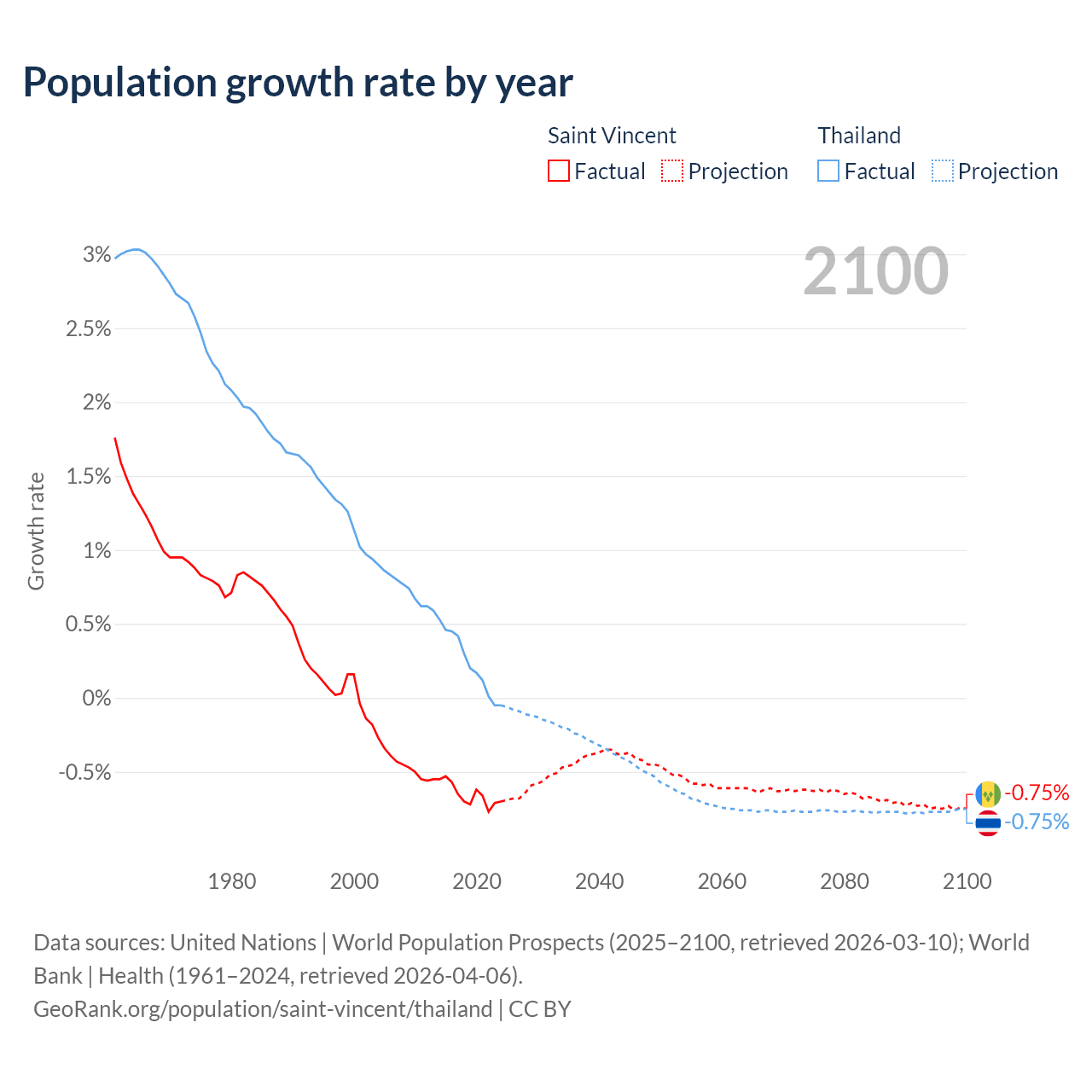 - For the last 10 years, Saint Vincent has had an average growth rate of -0.65% per year vs +0.23% in Thailand.