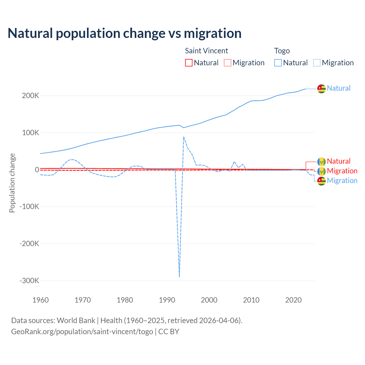 Over the last 10 years, 21.2% of the population change in Saint Vincent is from natural causes (a gain of 2,525 people) and 78.8% is from migration (a loss of 9,393 people). In Togo 99.1% is from natural causes (a gain of 2,052,115 people) and 0.86% is from migration (a loss of 17,852 people).