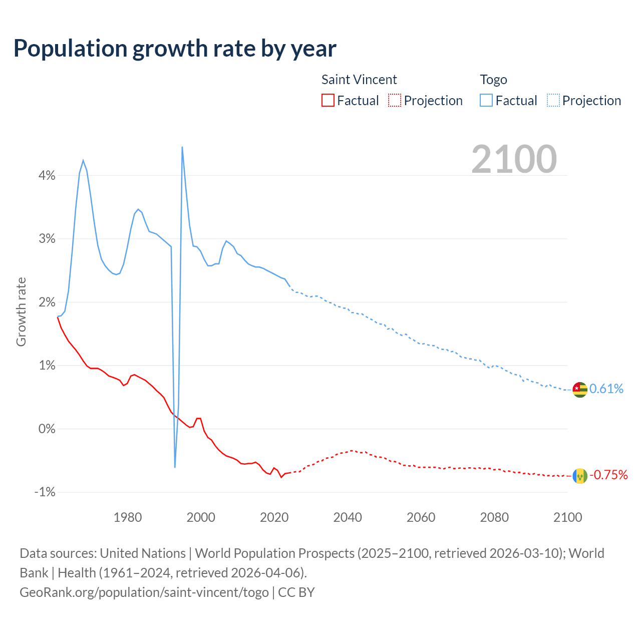 - For the last 10 years, Saint Vincent has had an average growth rate of -0.65% per year vs +2.46% in Togo.