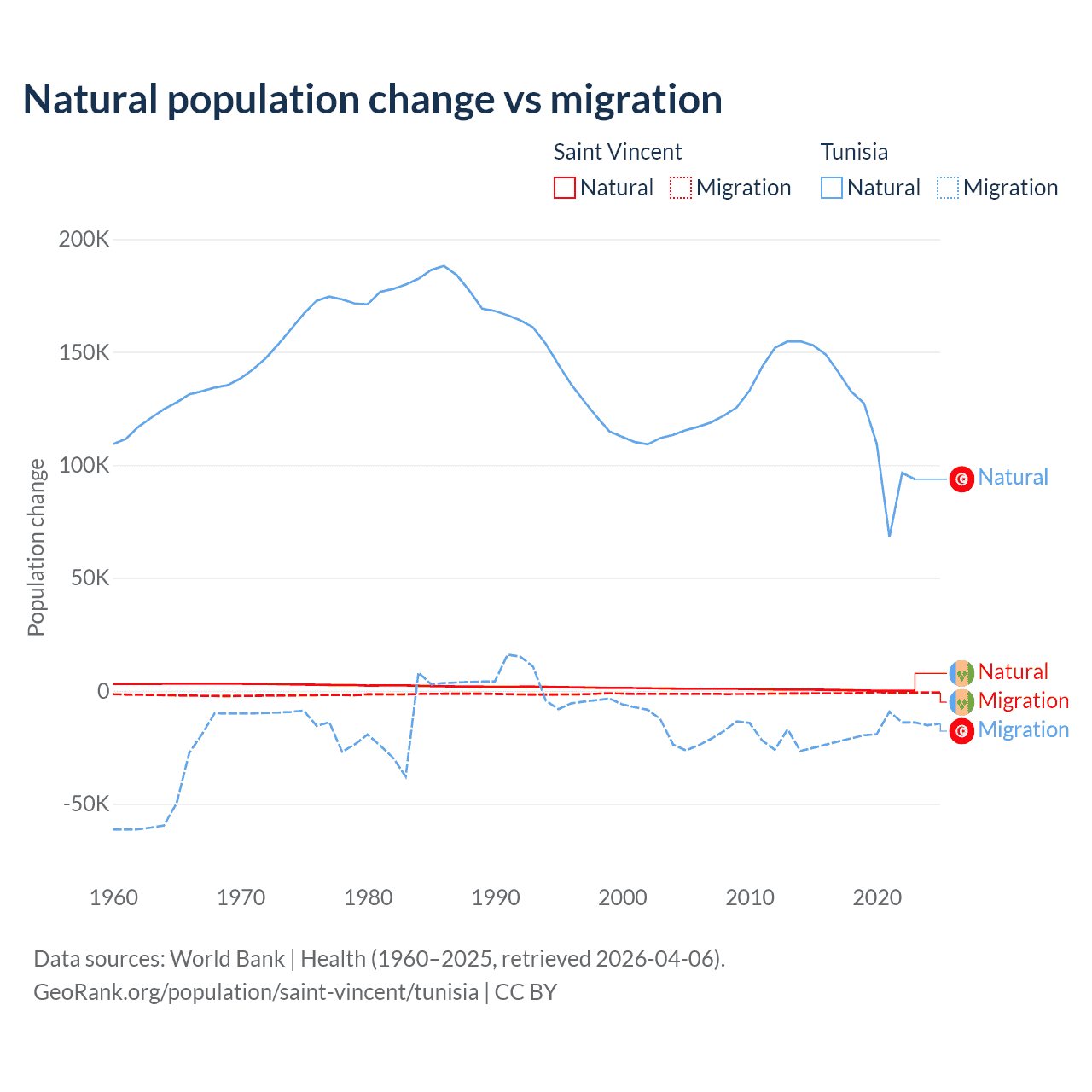 Over the last 10 years, 21.2% of the population change in Saint Vincent is from natural causes (a gain of 2,525 people) and 78.8% is from migration (a loss of 9,393 people). In Tunisia 86.3% is from natural causes (a gain of 1,225,079 people) and 13.7% is from migration (a loss of 195,011 people).