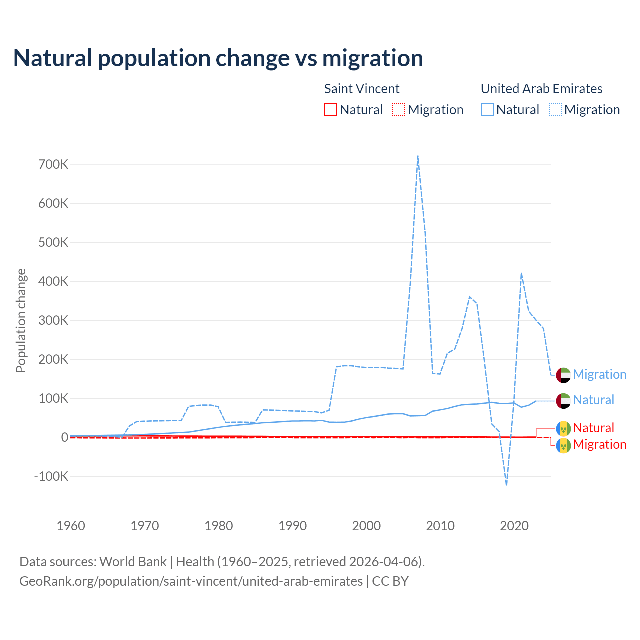 Over the last 10 years, 21.2% of the population change in Saint Vincent is from natural causes (a gain of 2,525 people) and 78.8% is from migration (a loss of 9,393 people). In the United Arab Emirates 30.5% is from natural causes (a gain of 857,996 people) and 69.5% is from migration (a gain of 1,958,520 people).