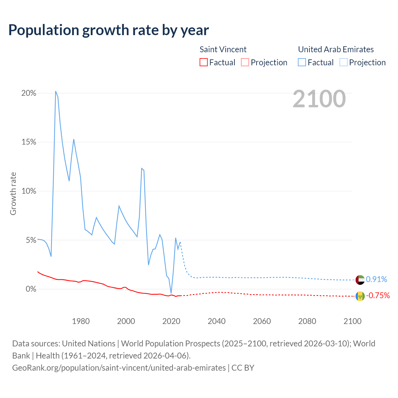 - For the last 10 years, Saint Vincent has had an average growth rate of -0.65% per year vs +3.31% in the United Arab Emirates.