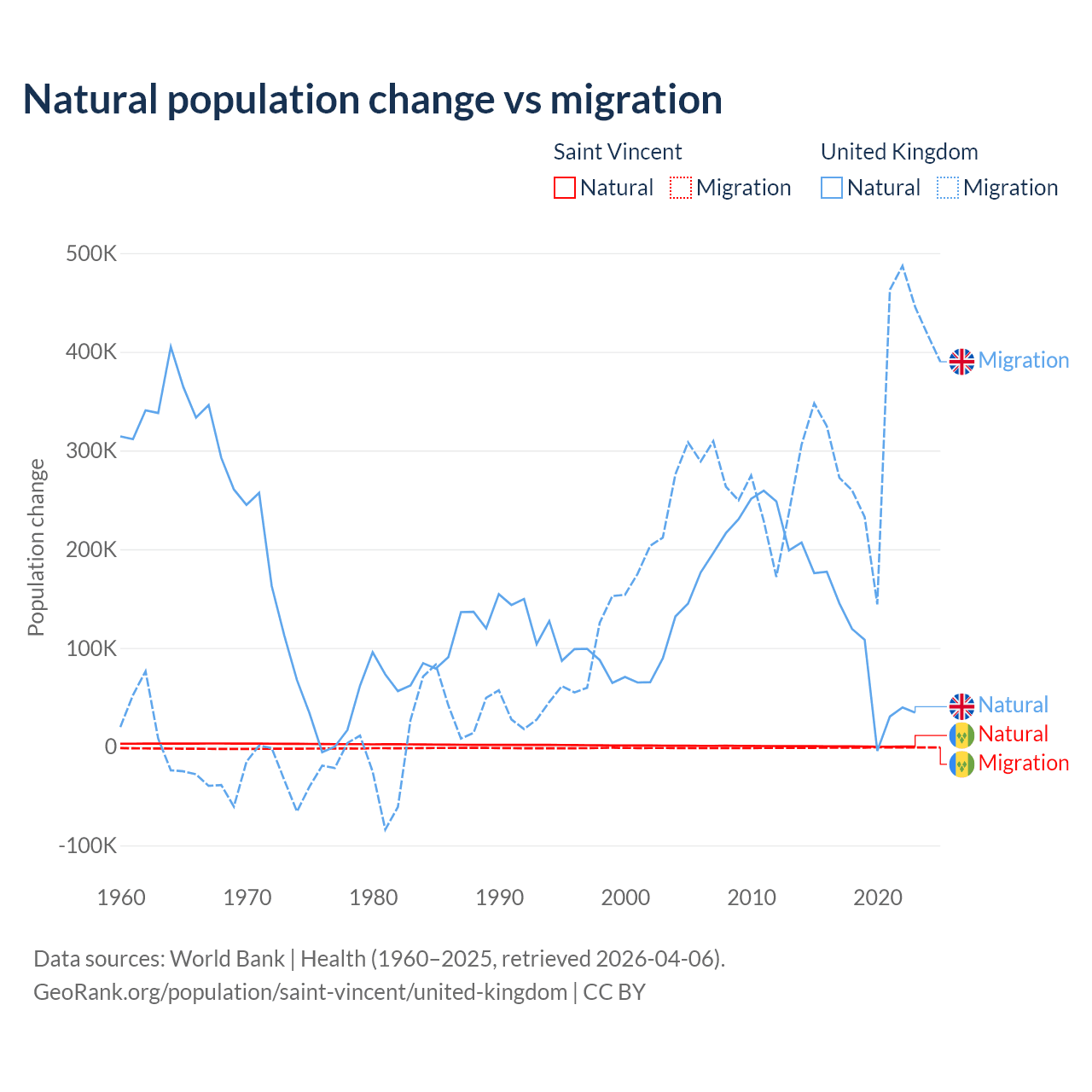 Over the last 10 years, 21.2% of the population change in Saint Vincent is from natural causes (a gain of 2,525 people) and 78.8% is from migration (a loss of 9,393 people). In the United Kingdom 23.9% is from natural causes (a gain of 1,033,129 people) and 76.1% is from migration (a gain of 3,283,101 people).