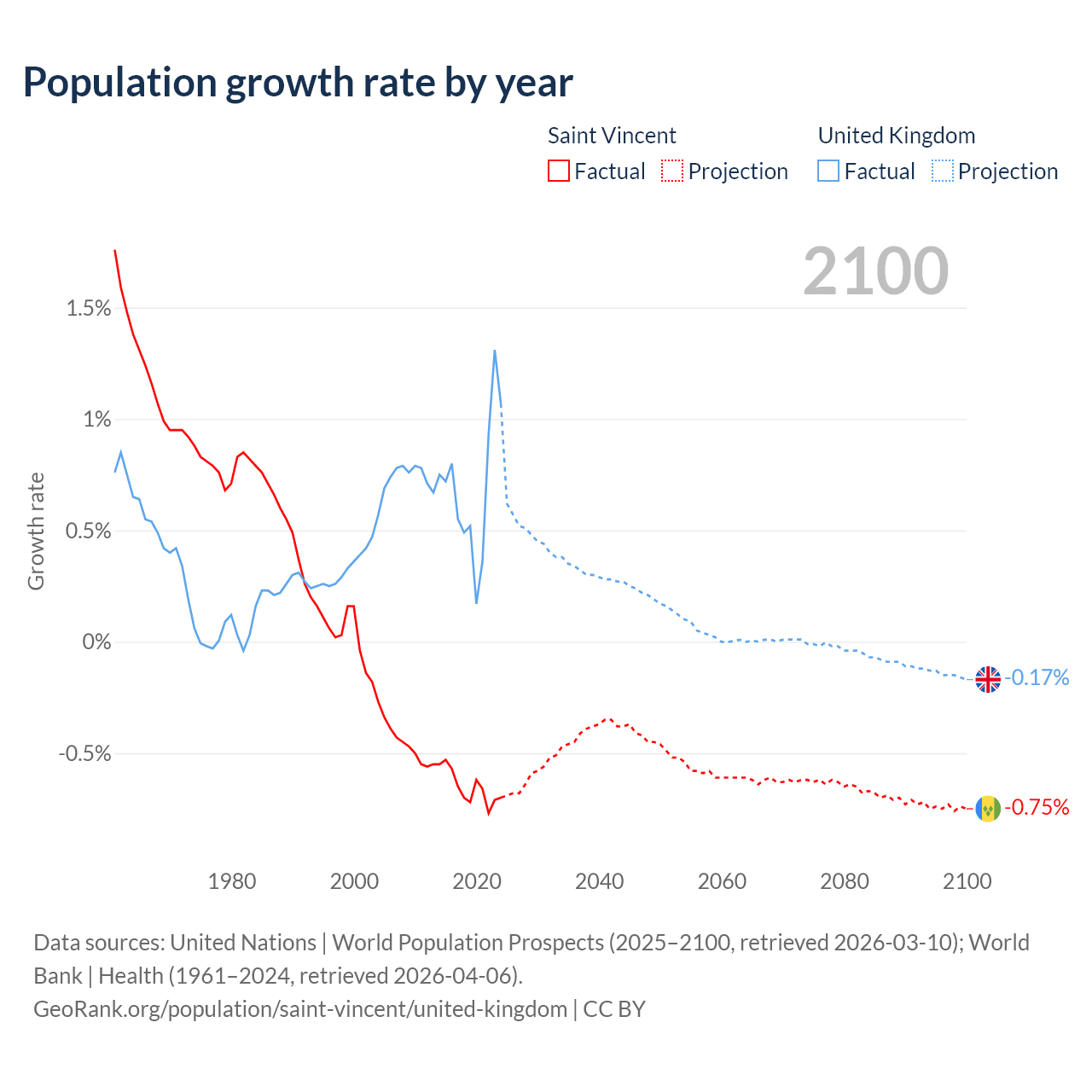 - For the last 10 years, Saint Vincent has had an average growth rate of -0.65% per year vs +0.7% in the United Kingdom.