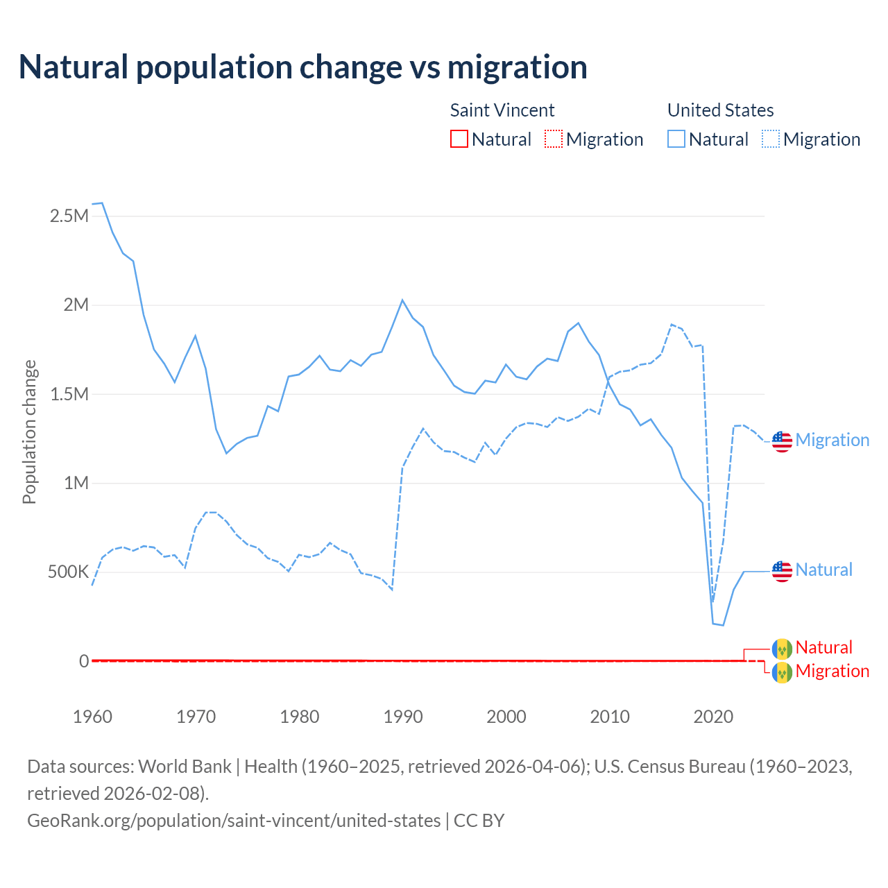 Over the last 10 years, 21.2% of the population change in Saint Vincent is from natural causes (a gain of 2,525 people) and 78.8% is from migration (a loss of 9,393 people). In the United States 35.8% is from natural causes (a gain of 8,005,866 people) and 64.2% is from migration (a gain of 14,334,286 people).